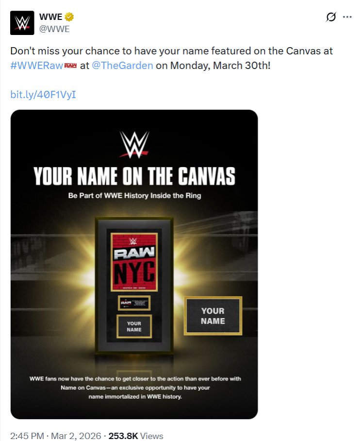 >WWE is offering fans the “exclusive opportunity” to have their names “immortalized in WWE history” for the March 30 episode of Raw at Madison Square Garden. Those who pay $399.99 will have their name featured on the ring, and they’ll then receive a framed collage with that piece of match-used canvas.