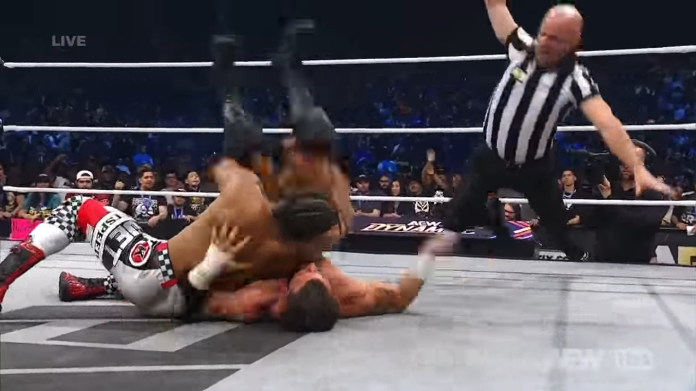 MJF kicking the ref might have been done too subtly for a live crowd even if it looked fine enough for the TV angles. Given a climb to the top rope is typically done in a way to draw and hold attention, it's easy to miss and have the spot imply the ref simply tripped getting out of the way of the move.The little frog hops on the count are laughable. I would assume this was done just to keep the heat down on the chick ref that's always trying to upstage the wrestlers. If there all clowns, you can't get mad at just one.