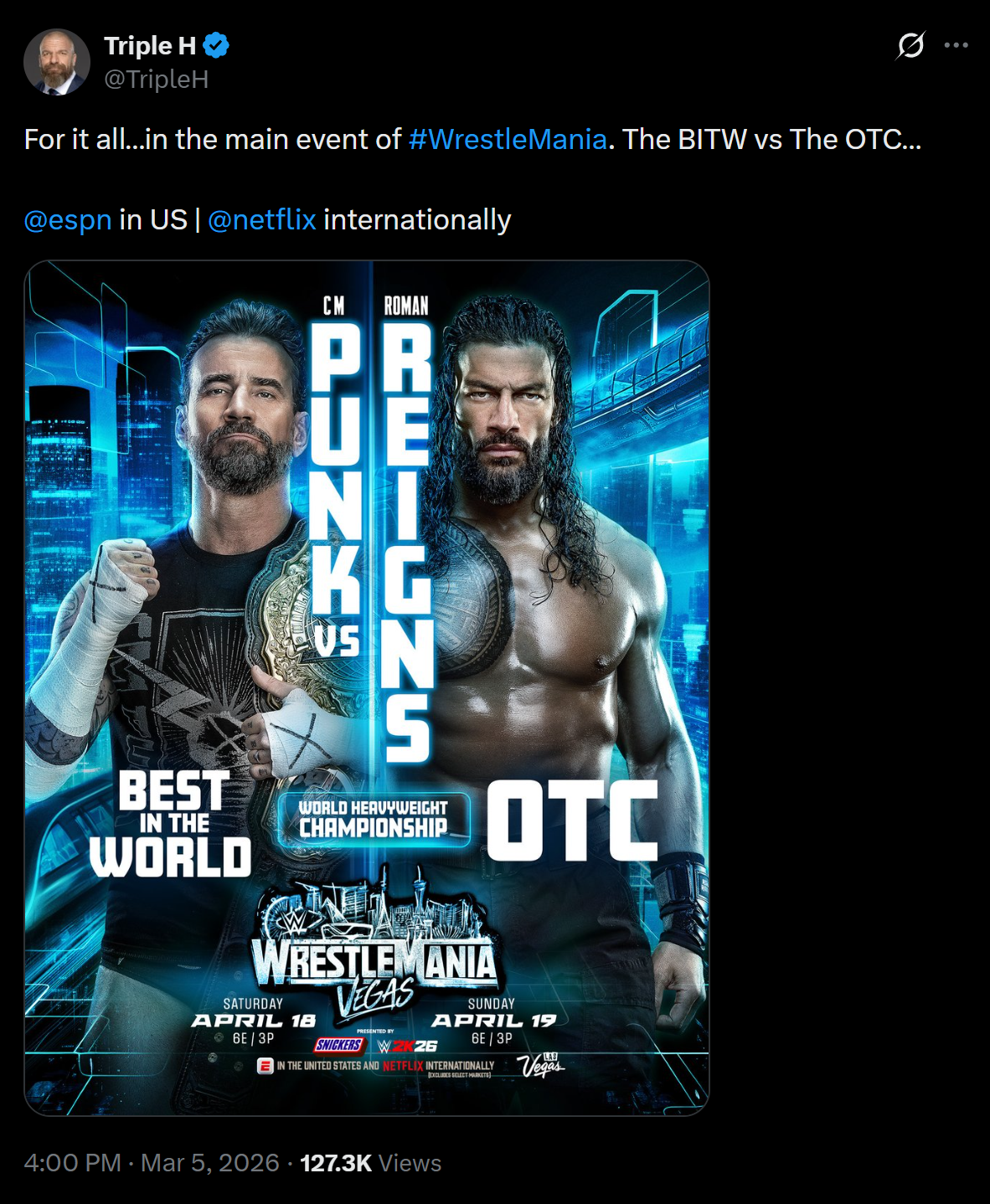 >You make a good point. WM this year will actually have 4 "main events" with the opening and closing match on each show. They'll probably do Cody vs Orton opener and Liv vs Vaquer on night 1. And then Rhea vs Jade opening and Punk Roman on night 2.