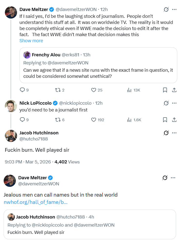 >>20013716>appeal to authority fallacyMeltzer isn't a journalist in any way, shape, or form. Nicky Piccy fucking cooked him.>Dave Meltzer continues to be one of the most successful and popular journalists in professional wrestling and in Mixed Martial Arts. >MMAHoly shit when was that nonsense written? How many years has it been since he got laughed out of MMA?