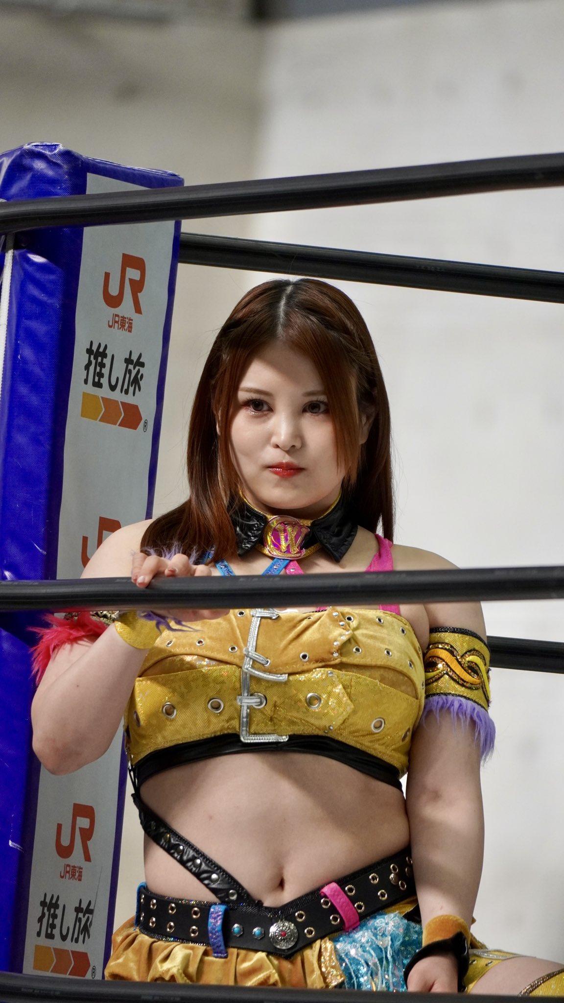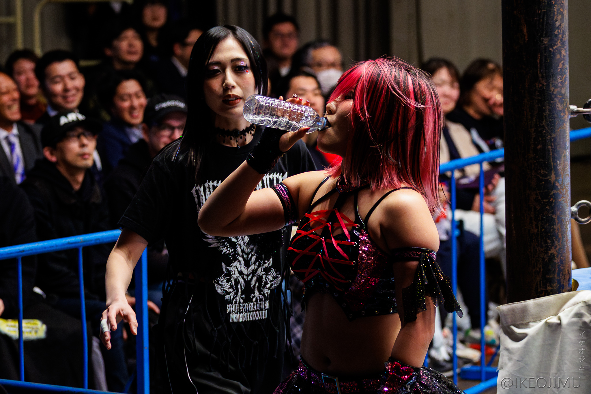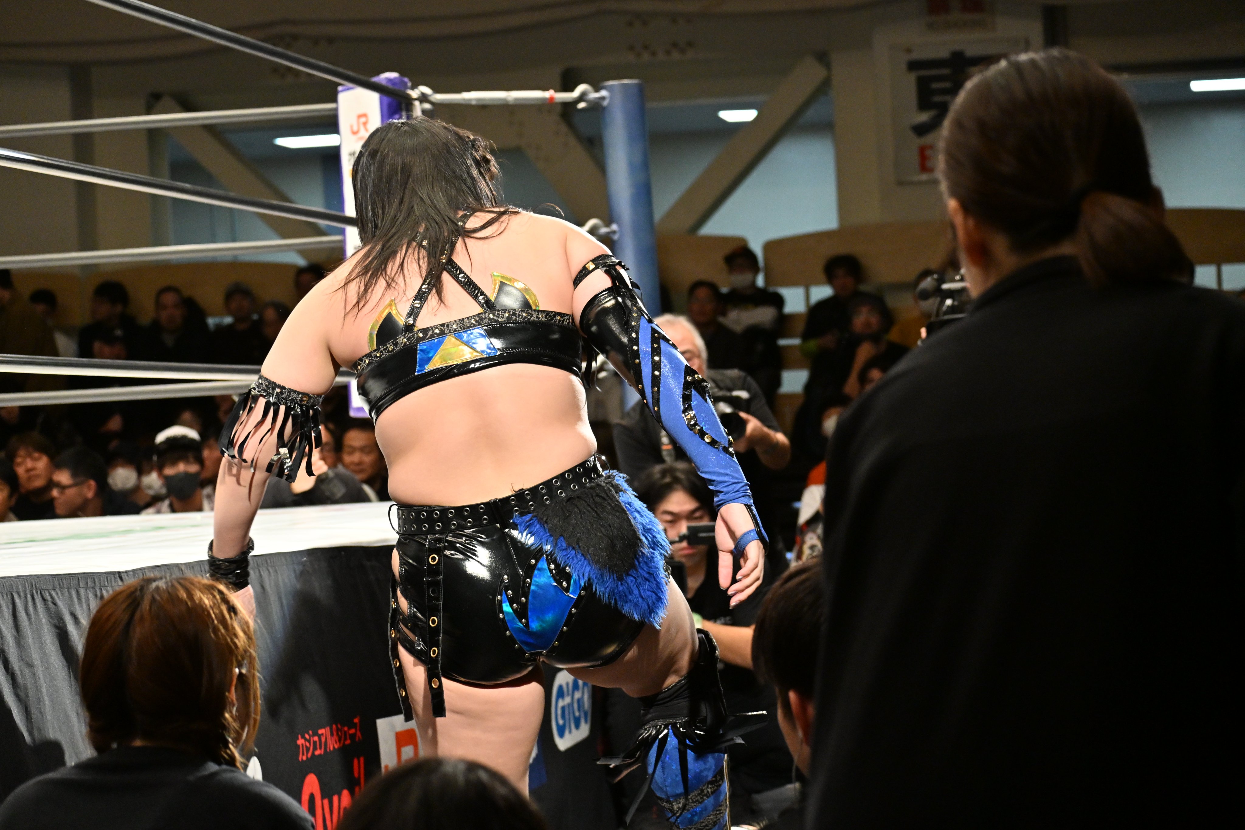 >JTO #pw_jto Korakuen. In the spotlight, Inaba Tomoka vs. TAKA Michinoku—Tomoka presses the attack with kicks, but TAKA secures the win with a sleeper hold. A finish in about 5 minutes. A harsh conclusion, with voices from the crowd going "Eh..." TAKA: "(Aside from karate kicks) My moves, only the moves I taught you. With that, you'll never surpass me in your lifetime." Tomoka, aiming to play to her strengths, calls for a match under JTO rules—no 3-counts, lost points system.Please come home
