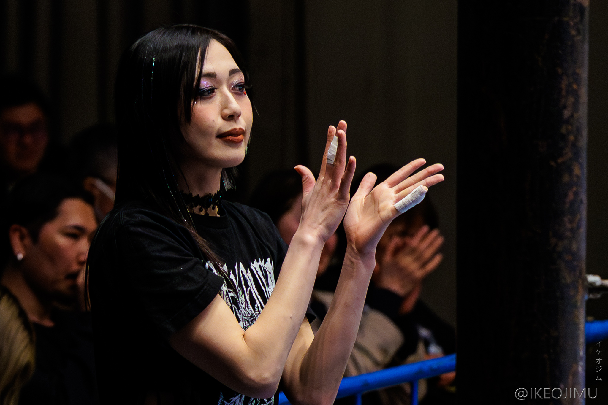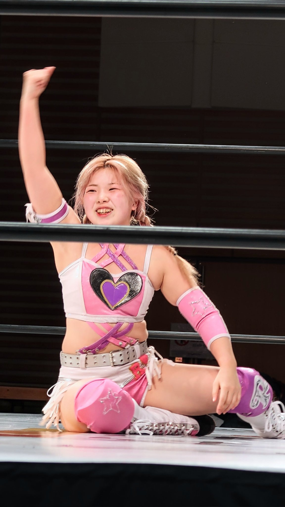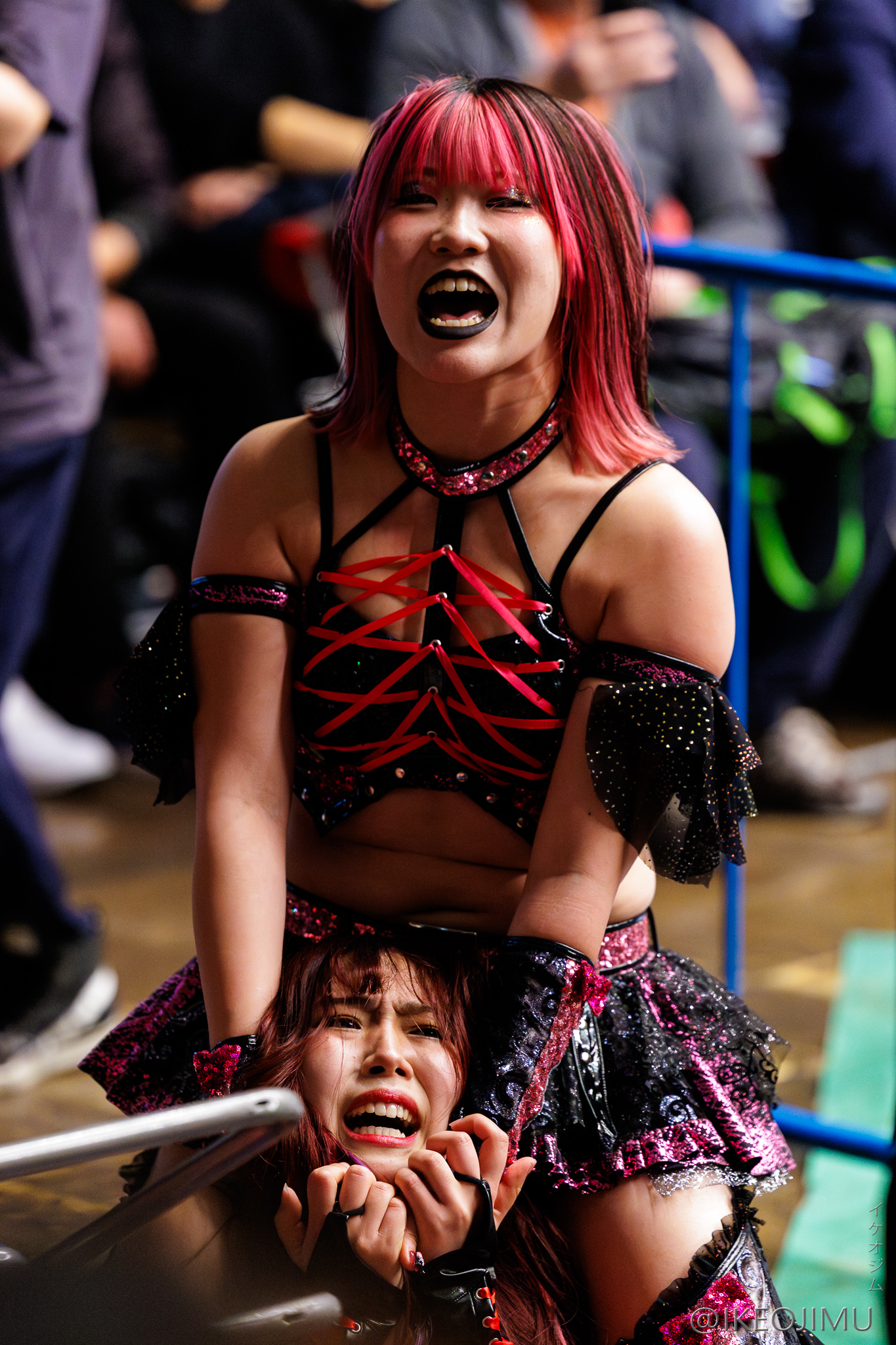 >JTO #pw_jto Korakuen. In the spotlight, Inaba Tomoka vs. TAKA Michinoku—Tomoka presses the attack with kicks, but TAKA secures the win with a sleeper hold. A finish in about 5 minutes. A harsh conclusion, with voices from the crowd going "Eh..." TAKA: "(Aside from karate kicks) My moves, only the moves I taught you. With that, you'll never surpass me in your lifetime." Tomoka, aiming to play to her strengths, calls for a match under JTO rules—no 3-counts, lost points system.Please come home