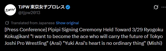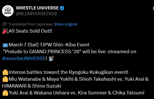 Watch on Wrestle Universe - 1,298 yen per month.https://www.wrestle-universe.com/enSchedule3.15 GRAND PRINCESS '26: FATE IN RYOGOKU @ Ryogoku KFC Hall, Tokyo (LIVE)[12:30 JST]3.17 TJPW TEXAS STAMPEDE - Austin DAY1 @ Palmer Events Center Hall 1, Austin (LIVE)[19:00 CST]3.18 TJPW TEXAS STAMPEDE - Austin DAY2 @ Palmer Events Center Hall 1, Austin (LIVE)[18:00 CST]3.21 TJPW TEXAS STAMPEDE - Dallas @ University of Texas College Park Center, Arlington (LIVE)[15:00 CST]3.22 TJPW TEXAS STAMPEDE - Houston @ POST Houston (LIVE)[15:00 CST]3.29 GRAND PRINCESS '26 @ Ryogoku Kokugikan, Tokyo (LIVE)[14:00 JST]Previous>>20008123