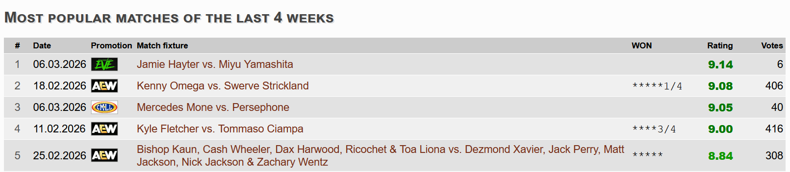 https://x.com/tjpw_gp/status/2030463516876865759>Uta vs Shion>Rika vs Raku vs Mahiro vs Hattori vs Mifu vs Kira vs Chika vs Matcha vs Momo Sato vs Minimo-chan>Bumping gRitters vs Konatsu/Toga