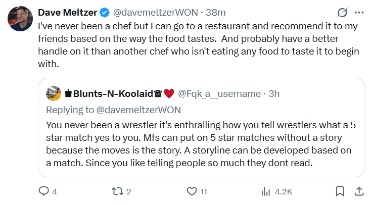 >>20027810Meltzgod just doesn’t miss does he.>I’m not a chef but I know if a restaurant is good better than a chef who has never been thereAbsolutely chefs kiss, no pun intended. Edrones don’t know what wrestling or even entertainment is.