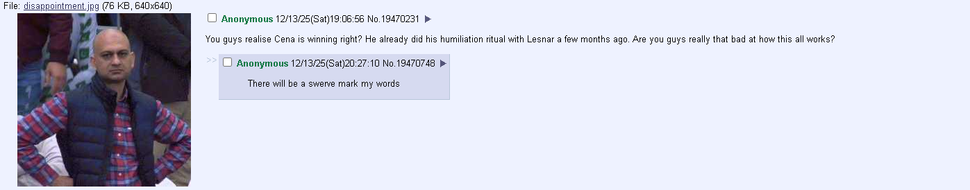 >>20030020Well, beating Cena did nothing for him. Even making him tap out for the first time in 21 years didn't do anything (not really helped when Cena literally corpsed while he was tapping out).