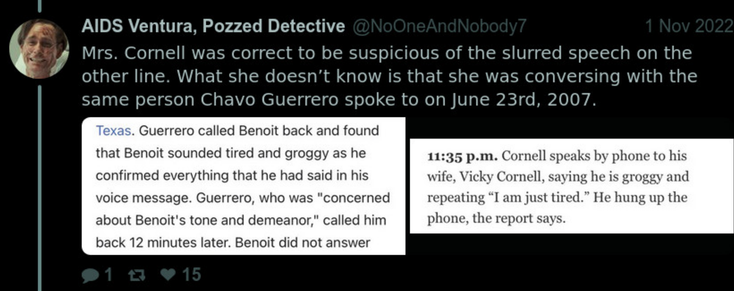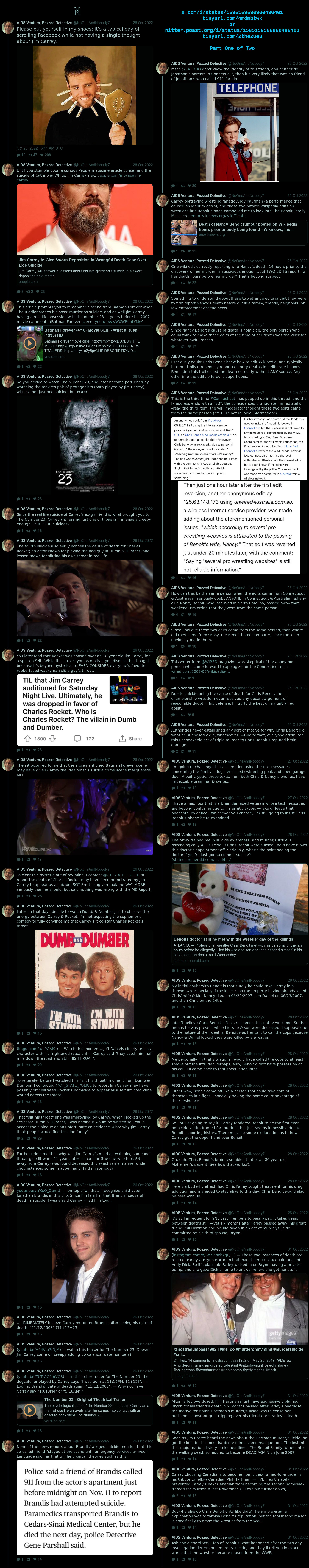 >>20032699>>20032705Benoit and his family were killed by Jim Carrey in 2007, soon after WrestleMania 23.>23Carrey got curious about WM since Jerry Lawler (his co-star from the 1999 movie about Andy Kaufman) was inducted into the WWE HoF in 2007 year, and Jim developed some murderous obsession with Benoit.>23Carrey is obsessed with the number 23 since youth (even starred a movie, "23", about 4 "suicides"), and he has likely killed several other people in very schizo ways around "23":>the actor who portrayed the bad guy in Dumb and Dumber>Chris Cornell (bled out after choked with gym equipment, just like Nancy's and Benoit's deaths combined) (same weird, dissuading conversation by great voice impersonator with respective family/friend of victim after the act)>Carrey's own gfLet's see:>sociopath>obsessed with 23>obsessed with "erasure">weird, lonely "crazy artist">kills an actor he knows from youth (the one from whom got the "23" obsession) because took his spot in snl>kills soundgarden leader (with whom shared some tv show in the late 90s) due to some schizo obsession>kills a wrestler due to yet another schizo obsessionYup, solid hypothesis