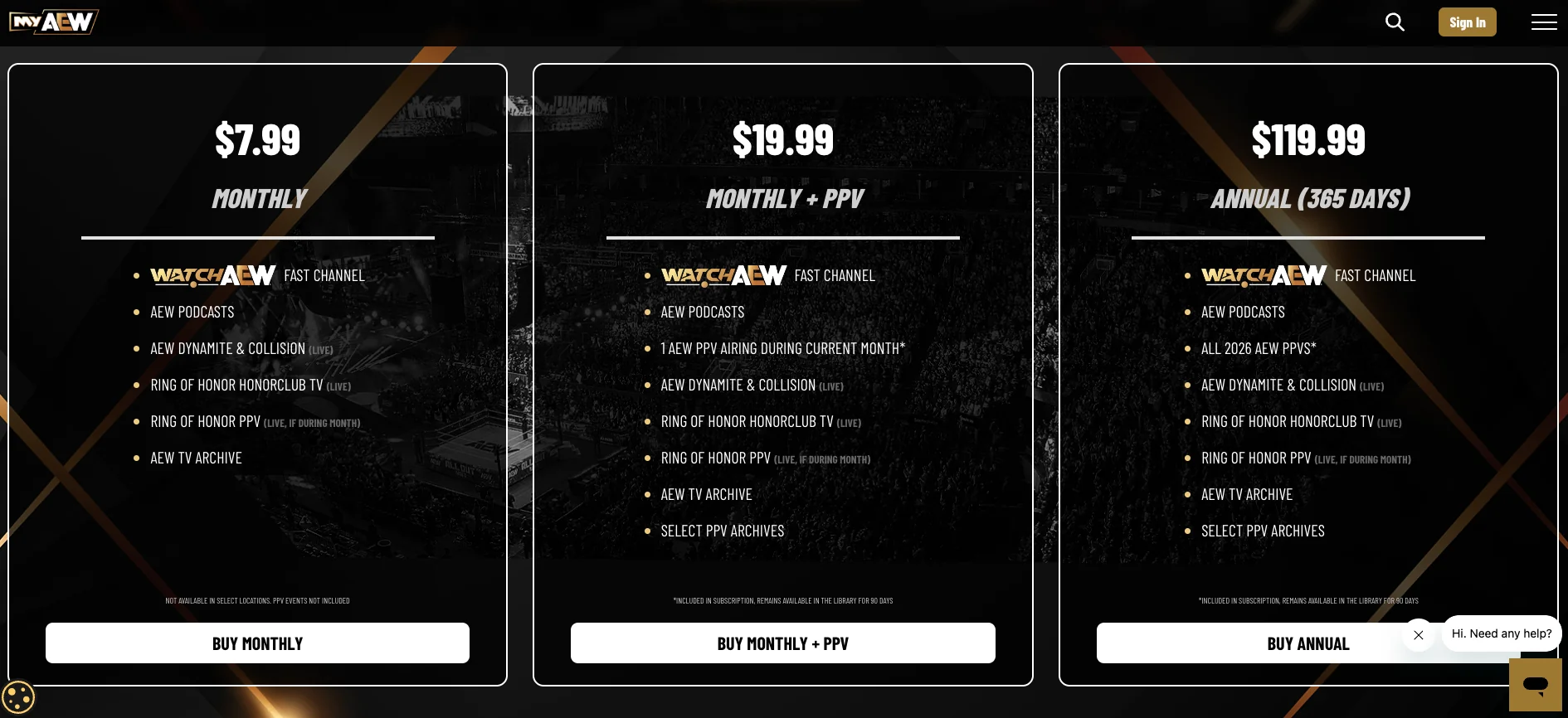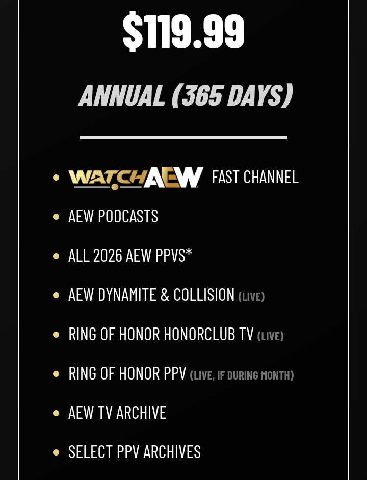 I like how anything that could be worth the highest tier package has an asterisk.>LIVE ROHbut no mention of archive shows if you can't watch live>SELECT ARCHIVE PPVSSo not all of them>Podcaststhe ones that used to be free?>ALL 2026 PPVSYou only keep them for 90 days?