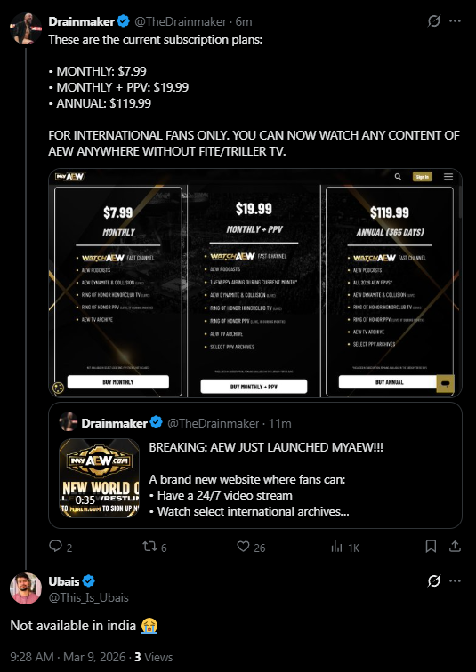 >>20034904>March 23, 2026?Kek what's with that bizarrely specific date? I expect news of AEW's cancellation to drop around the time that the Paramount+WBD merger gets regulatory approval and starts to actually happen.>>20034913>AEWtist desperately trying to pretend MyAEW is international-only even though it's streaming in the US right the fuck now and has a US pricing plan ready to golel