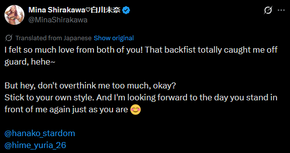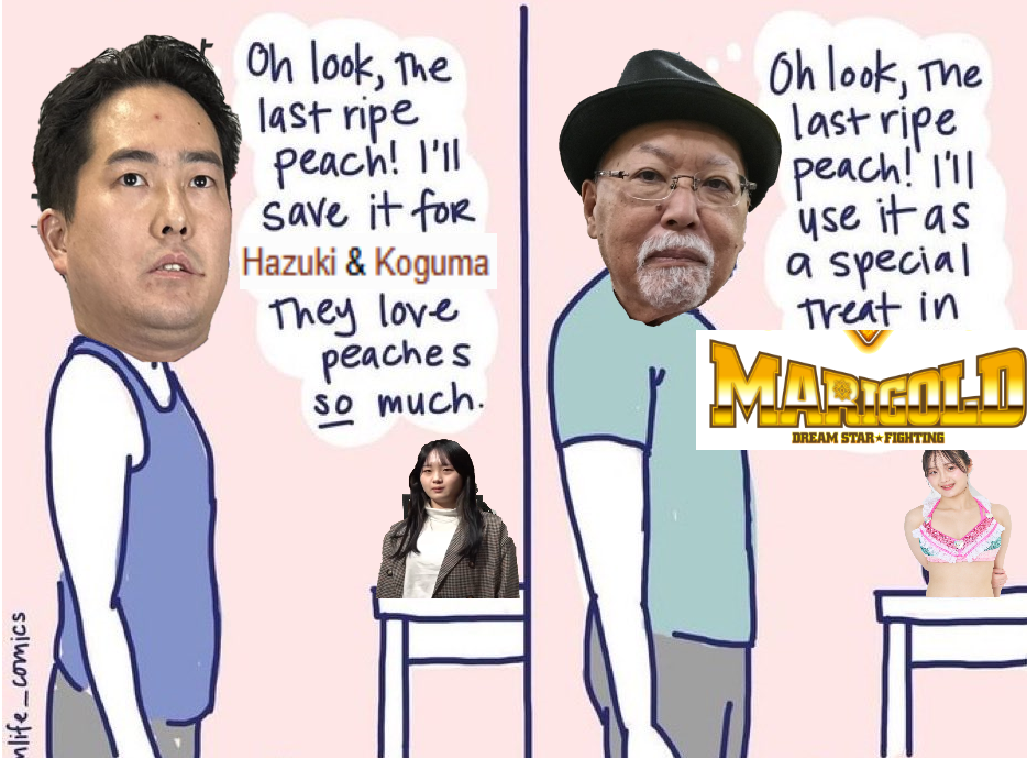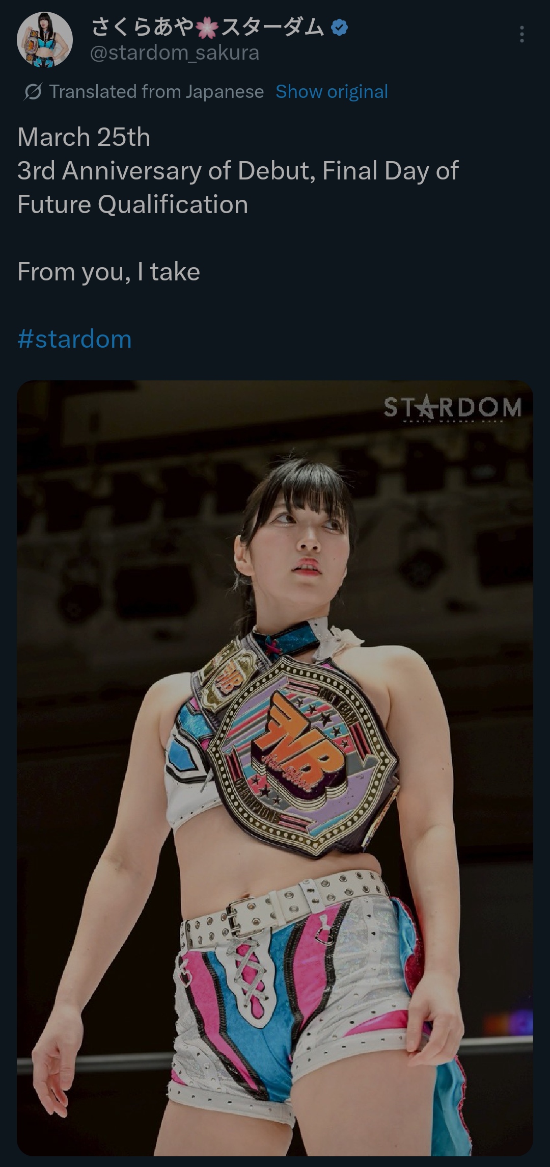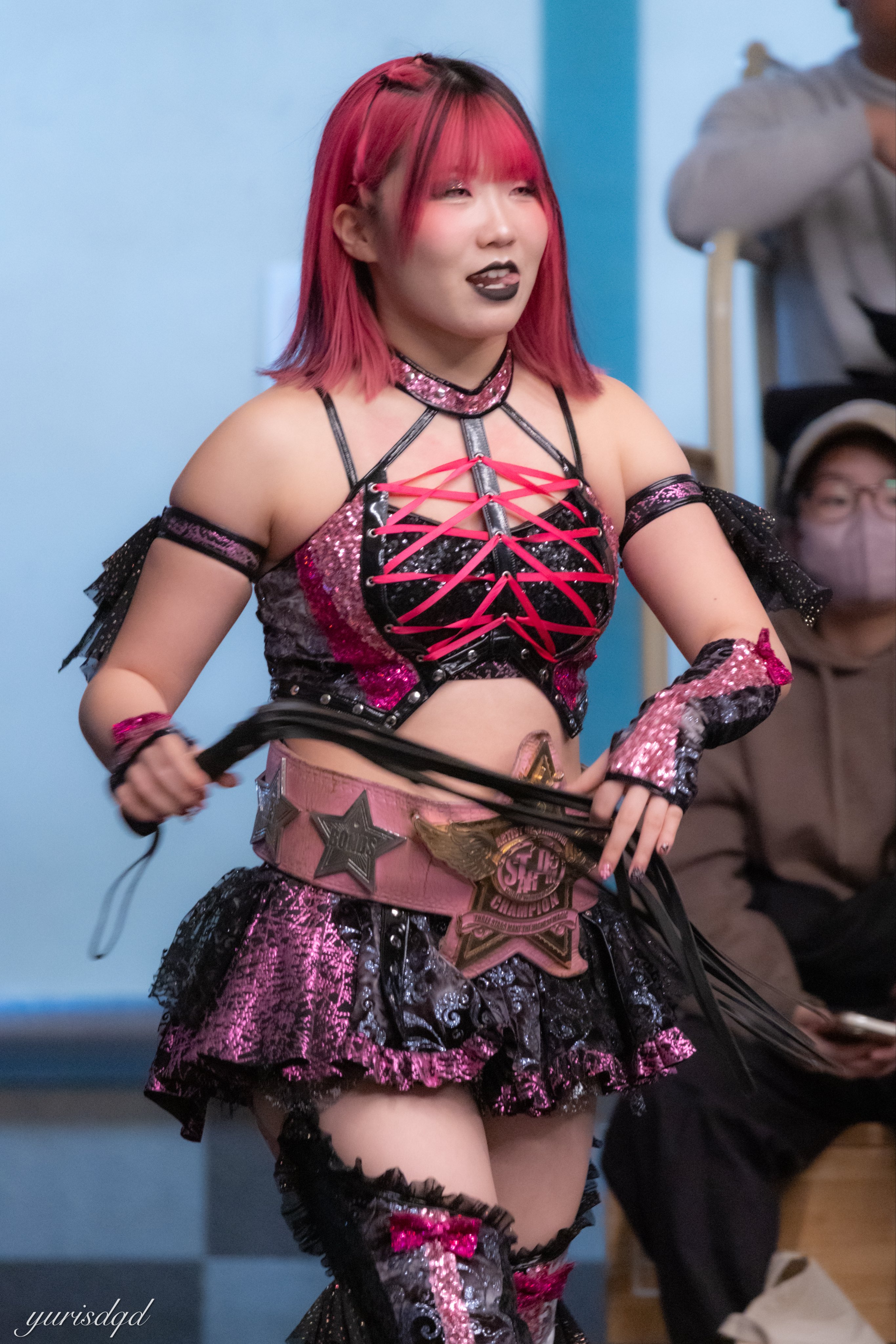 >3.11 Korakuen Hall Event Post-Match Comments>Saya Kamitani: "Saya-sama will make her comeback at the 3.15 Yokohama Budokan. This red belt is currently Saya-sama's most precious possession. Isn't it unfair that only I am putting the red belt on the line?>So, if Kurara is going to stake her most precious possession right now, I'll let you think about it. This is homework from me. By the next Yokohama Budokan, Kurara, you better have an answer."Well it looks like we're going to have the "Kurara joins H.A.T.E. if she loses" stip
