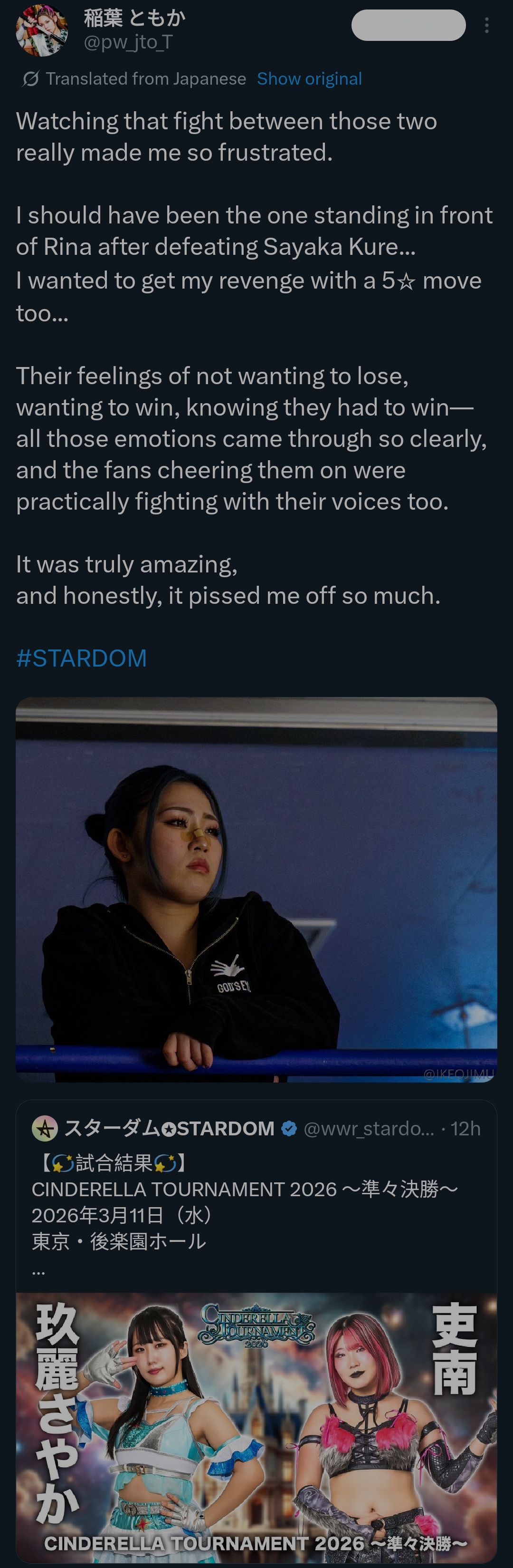March 15th, "CINDERELLA TOURNAMENT 2026 ~The Winning Battle~", Yokohama Budokan, Kanagawa, 4:30PM JST (PPV/Samurai TV)>Cinderella Tournament Semifinal Match: Hanan (STARS) vs Aya Sakura (COSMIC ANGELS)>Cinderella Tournament Semifinal Match: Rina (H.A.T.E.) vs Miyu Amasaki (NEO GENESIS)>Sareee & Takumi Iroha (Spark Rush) vs X & XX>Future of Stardom Championship: (c) HANAKO (-) vs Ranna Yagami (God's Eye)>CMLL-Japan Women's Championship: Hazuki (c) vs India Sioux (CMLL)>Saya Kamitani & Konami (H.A.T.E.) vs Natsupoi & Sayaka Kurara (COSMIC ANGELS)>Cinderella Tournament Final Match:>Rest of card tba: https://wwr-stardom.com/event/20260315_yokohama/March 20th, "The VENUS SPLASH2026", Boat Race Miyajima Event Hall, Hiroshima>https://wwr-stardom.com/schedule/20260320_miyajima/March 21st, "The VENUS SPLASH2026", Boat Race Miyajima Event Hall, Hiroshima>https://wwr-stardom.com/schedule/20260321_miyajima/Previous >>20045034