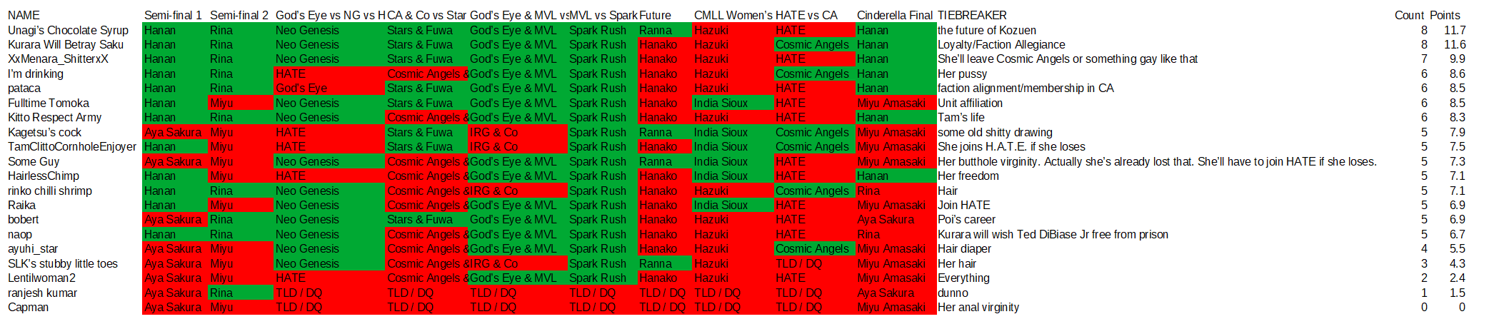 my only nitpick is with Rina beating Miyu,wouldn't it have been1. cooler to say that all 3 sisters made it to the final four?2. add more drama if Rina beat Hina heading into the match with Hanan?
