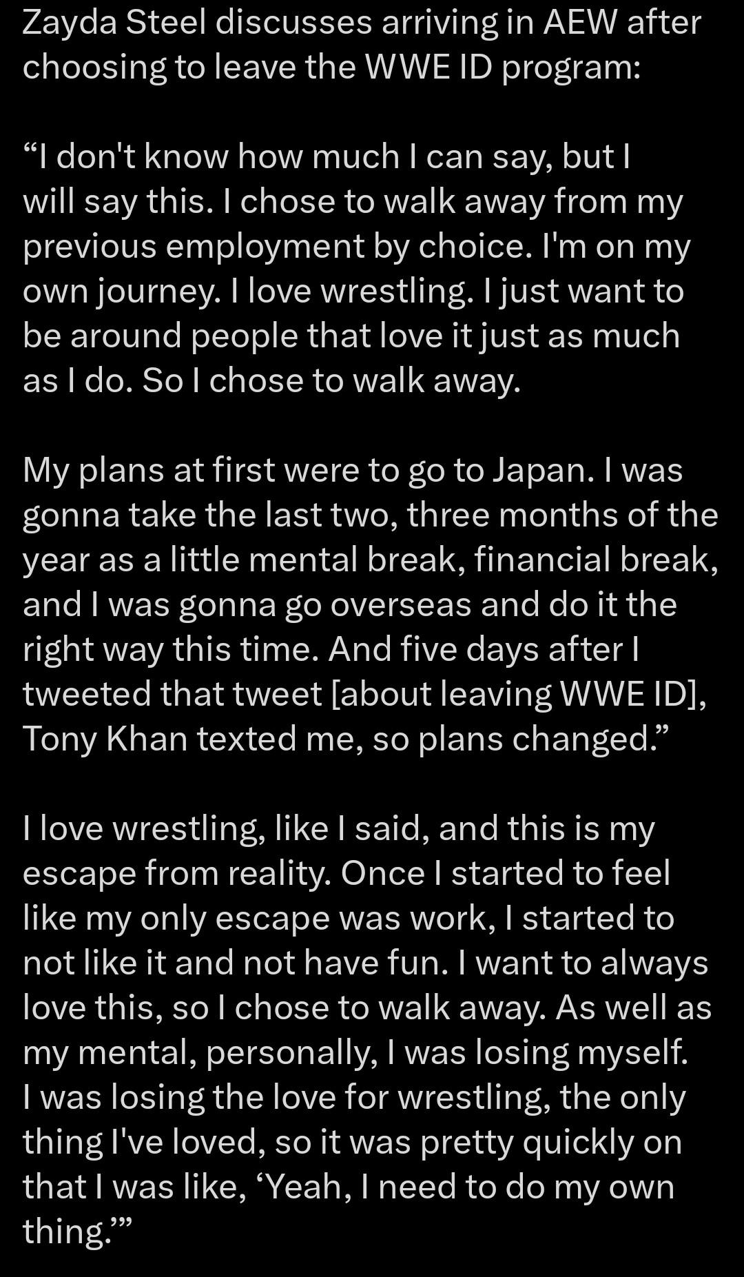 Mercedes Martinez: >"I am blessed for the opportunity that Tony [Khan] gave me for the last four years. But it felt like the last year and a half, almost two years, I just sat on the shelf not doing anything for the company. It kind of messes with your mind a lot. It kind of just makes you [say] is it really worth it? Does he really want to utilize my talent and my expertise? I know my style is not like a TV style. It’s very raw. It’s very rugged. It’s very old school in the sense of very power and strong style. Maybe the girls don’t want to wrestle somebody like me with that style because it’s very raw. But I also look at Eddie Kingston and be like, ‘Well, if he can do it, I know I can do it.’ You need a female like that."https://www.fightful.com/wrestling/mercedes-martinez-says-aew-run-pushed-her-to-decide-that-2026-will-be-her-final-year-as-a-full-time-wrestler/