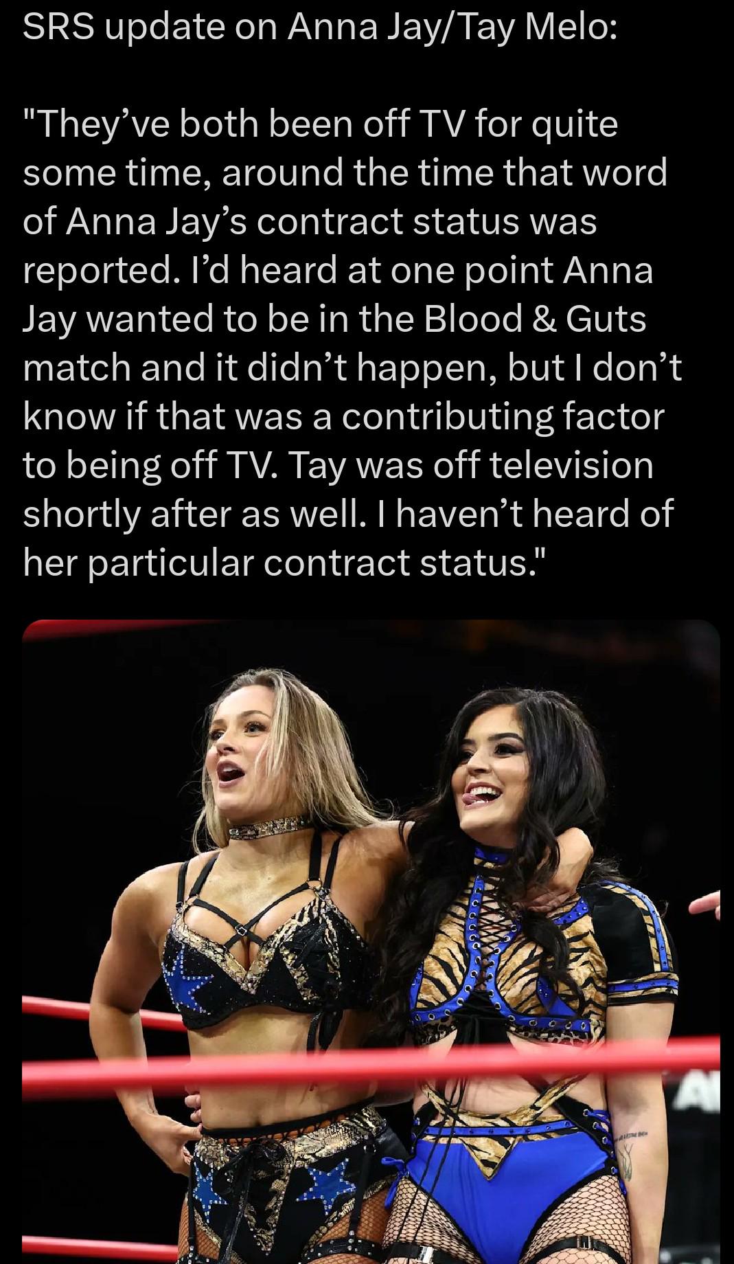 >>20099371>Anna JayNXT Bound>Lady FrostWon't get renewed>Dr. Britt Baker DMDWill leave wrestling>Queen AminataWill renew>Deonna PurrazzoPlease leave