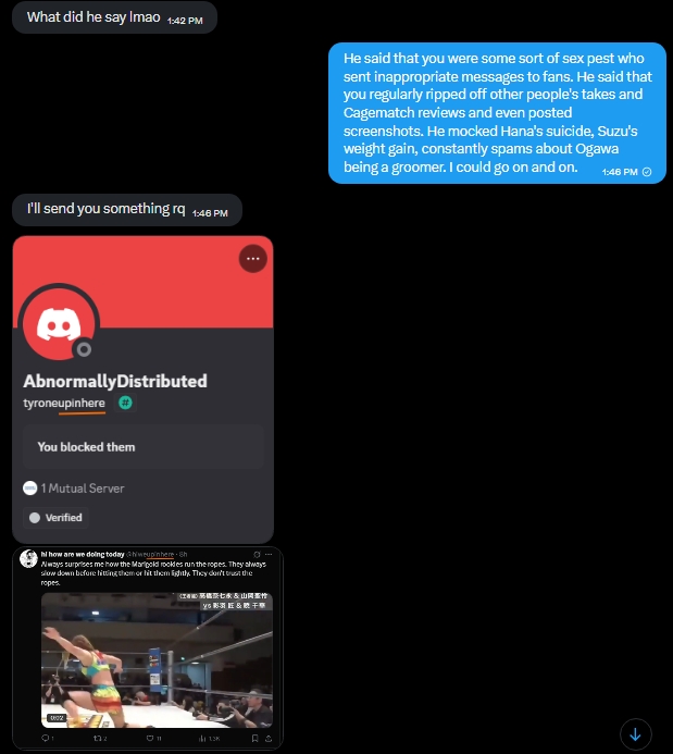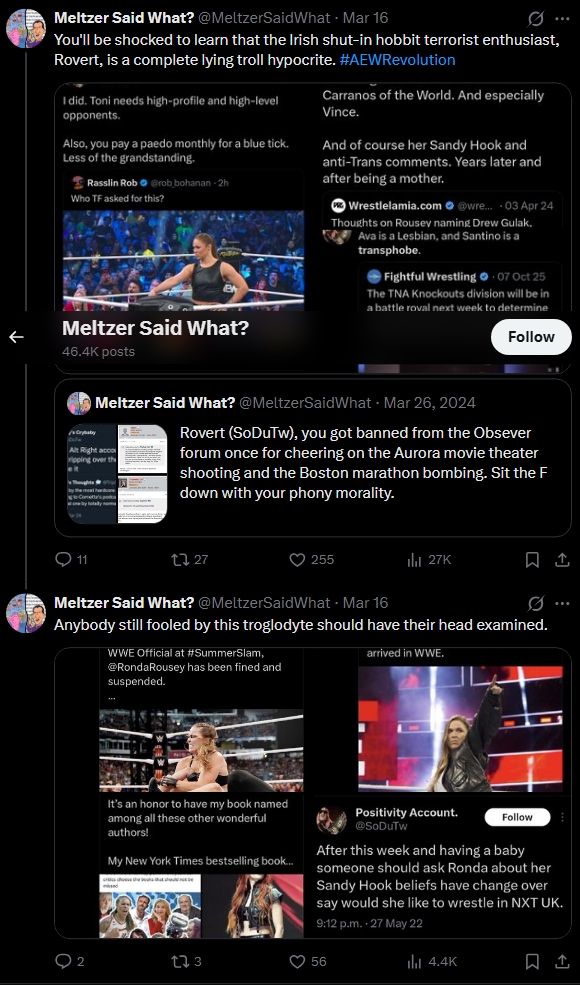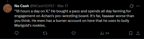 >>20103104You're sitting at 600K Tweets, Trevor. You live online, are hated by everyone, and are the pro-wrestling version of Chris Chan.Your Yawhatisthedeal alt account gets no engagement whatsoever, that's why these posts don't get any traction.
