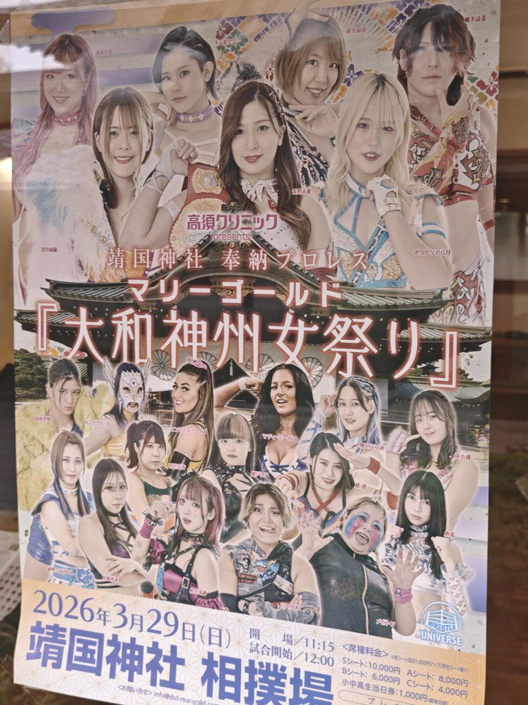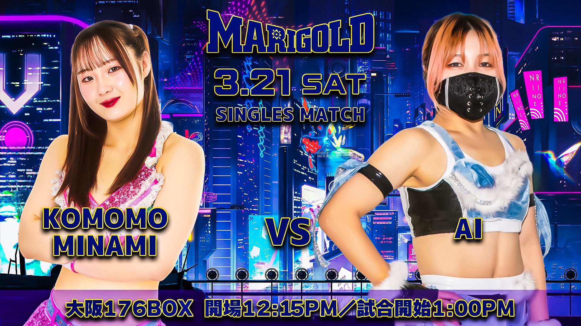 >MARIGOLD Spring Victory Series 20263/20 Matsuyama City General Community Center (VOD 3/23 @ 6:00pm)3/21 Osaka 176BOX (1:30pm)>Miku Aono, Kouki Amarei, & Nagisa Tachibana vs Seri Yamaoka, Shinno, & Yuuka Yamazaki>Trial of 7 Battles #4: SYOKO Koshino vs Mayu Iwatani>Utami Hayashishita, Chika Goto, & Nao Ishikawa vs Mai Sakurai, Angel Hayze, & Maddy Morgan>Natsumi Showzuki & Megaton vs Misa Matsui & CHIAKI>Victoria Yuzuki vs Hummingbird vs Rea Seto>Komomo Minami vs AI3/28 Shinjuku FACE (Live @ 12:00pm)>GHC Women's & Superfly Championship: Mayu Iwatani (c) vs Natsumi Showzuki>Miku Aono, Mai Sakurai, & Mayumi Ozaki vs CHIAKI, Rea Seto, & Nagisa Nozaki>Utami Hayashishita, Kouki Amarei, & Hummingbird vs Angel Hayze, Maddy Morgan, & Megaton>Trial of 7 Battles #5: SYOKO Koshino vs Chika Goto>Victoria Yuzuki, Komomo Minami, & Nagisa Tachibana vs Seri Yamaoka, Shinno, & Yuuka Yamazaki>Nao Ishikawa vs Misa Matsui vs AI3/29 Yasukuni Shrine Sumo Ring (12:00pm)>3D Trios Championship: Mai Sakurai, Natsumi Showzuki, & Erina Yamanaka (c) vs Seri Yamaoka, Shinno, & Yuuka Yamazaki>Mayu Iwatani, Victoria Yuzuki, & Komomo Minami vs Misa Matsui, CHIAKI, & Rea Seto>Trial of 7 Battles #6: SYOKO Koshino vs Nagisa Nozaki>Miku Aono & Kouki Amarei vs Utami Hayashishita & Nao Ishikawa>Chika Goto & Hummingbird vs Angel Hayze & Maddy Morgan>Nagisa Tachibana vs Megaton vs AI>Socialshttps://dsf-marigold.comhttps://x.com/DSF_Marigoldhttps://x.com/Marigold_Joshihttps://x.com/hashtag/pw_mghttps://www.instagram.com/dsf_marigold/https://www.youtube.com/@MARIGOLD-ho5nzWatch on Wrestle Universe (¥1,298 per month)https://www.wrestle-universe.com/en/marigold>Entrance musichttps://youtube.com/playlist?list=OLAK5uy_mz1s3xkNlFsMmySZlRdsEkxjj2isTVUEsPrevious >>20097158