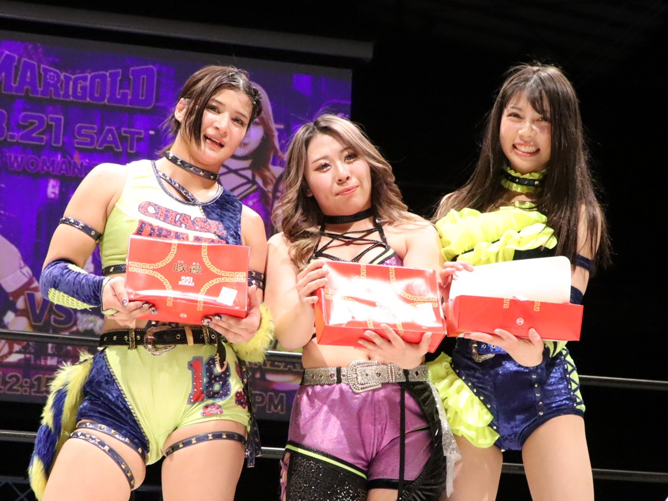 >Mai Sakurai teamed with Ehime Pro Wrestling’s Tsuruhimeka and Shinno, and defeated Utami Hayashishita, Chika Goto, and Nagisa Tachibana.>Sakurai: “Next week we’ll be fighting with the 3D Trios on the line, and I want to make you feel just how tough this belt really is…”>Tsuruhimeka: “Her mother has appeared for Ehime Pro Wrestling for a long time, and because of that she came to Ehime Pro Wrestling as the ‘merch boss’…”>Shinno: “I’m really happy that we were able to team as a trio with Himeka-san at this venue I’ve wanted to wrestle at for so long, and win…”https://x.com/DSF_Marigold/status/2034937823351161210