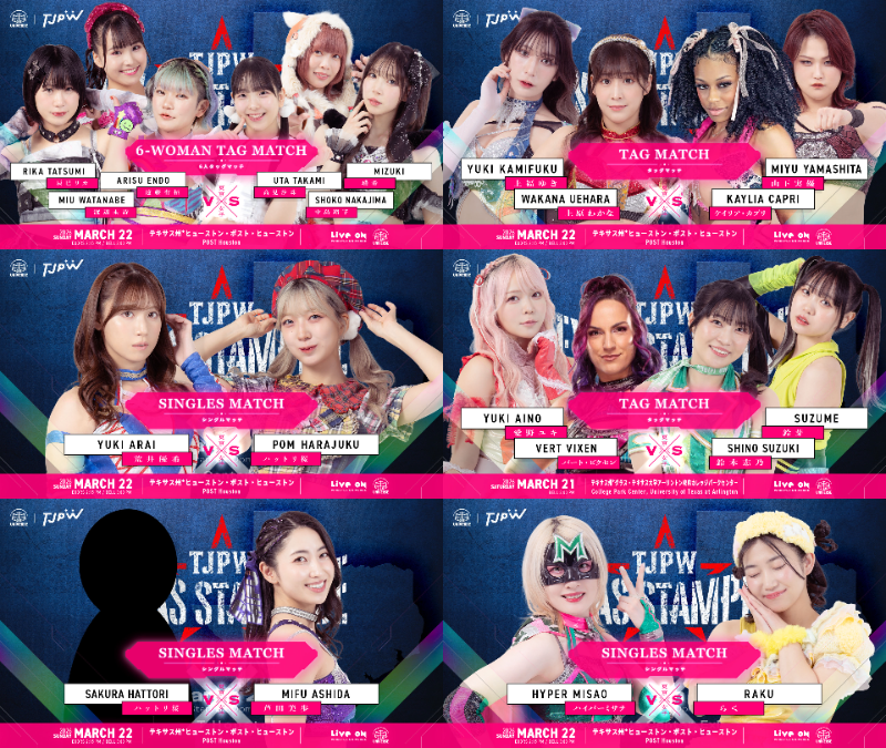 Watch on Wrestle Universe - 1,298 yen per month.https://www.wrestle-universe.com/enSchedule3.22 TJPW TEXAS STAMPEDE - Houston @ POST Houston (LIVE)[15:00 CST]3.29 GRAND PRINCESS '26 @ Ryogoku Kokugikan, Tokyo (LIVE)[14:00 JST]4.4 HOME CHEER HOME ~Mifu Ashida's Hometown Triumphant Return Performance~ @ Sandanike Park General Gymnasium, Fukuchiyama (VOD)[12:30 JST]4.5 TJPW SPRING TOUR 2026~NEXT DOOR~in FUKUOKA @ ACROS Fukuoka, Fukuoka (VOD)[12:30 JST]4.8 Warm Spring Pro Wrestling in Ueno @ Ueno Park Outdoor Stage, Tokyo (VOD)[17:30 JST]4.11 Gaisen Sakura Pro Wrestling 2026 @ Shinjo Village, Okayama (VOD)(12:30 JST]4.11 Vancouver Premiere DAY1 @ Great Canadian Hastings Racecourse & Casino, Vancouver [19:00 PDT]4.12 Vancouver Premiere DAY2 @ Great Canadian Hastings Racecourse & Casino, Vancouver [11:30 PDT]4.16 TJPW LIVE in Las Vegas 2026 @ Pearl Concert Theater, Las Vegas (LIVE on TrillerTV)[11:00 PDT]4.18 TJPW INSPIRATION #11 @ TOKYOSQUARE in Itabashi, Tokyo (VOD)[12:30 JST]4.24 TJPW SPRING TOUR 2026~NEXT DOOR~in SHINJUKU @ Shinjuku FACE, Tokyo (LIVE)[19:00 JST]4.29 WRESTLE UNIVERSE Members Only Event "Pre-Tokyo Joshi Pro-Wrestling.10" @ Itabashi Green Hall, Tokyo (VOD)[15:00 JST]Previous>>20110488