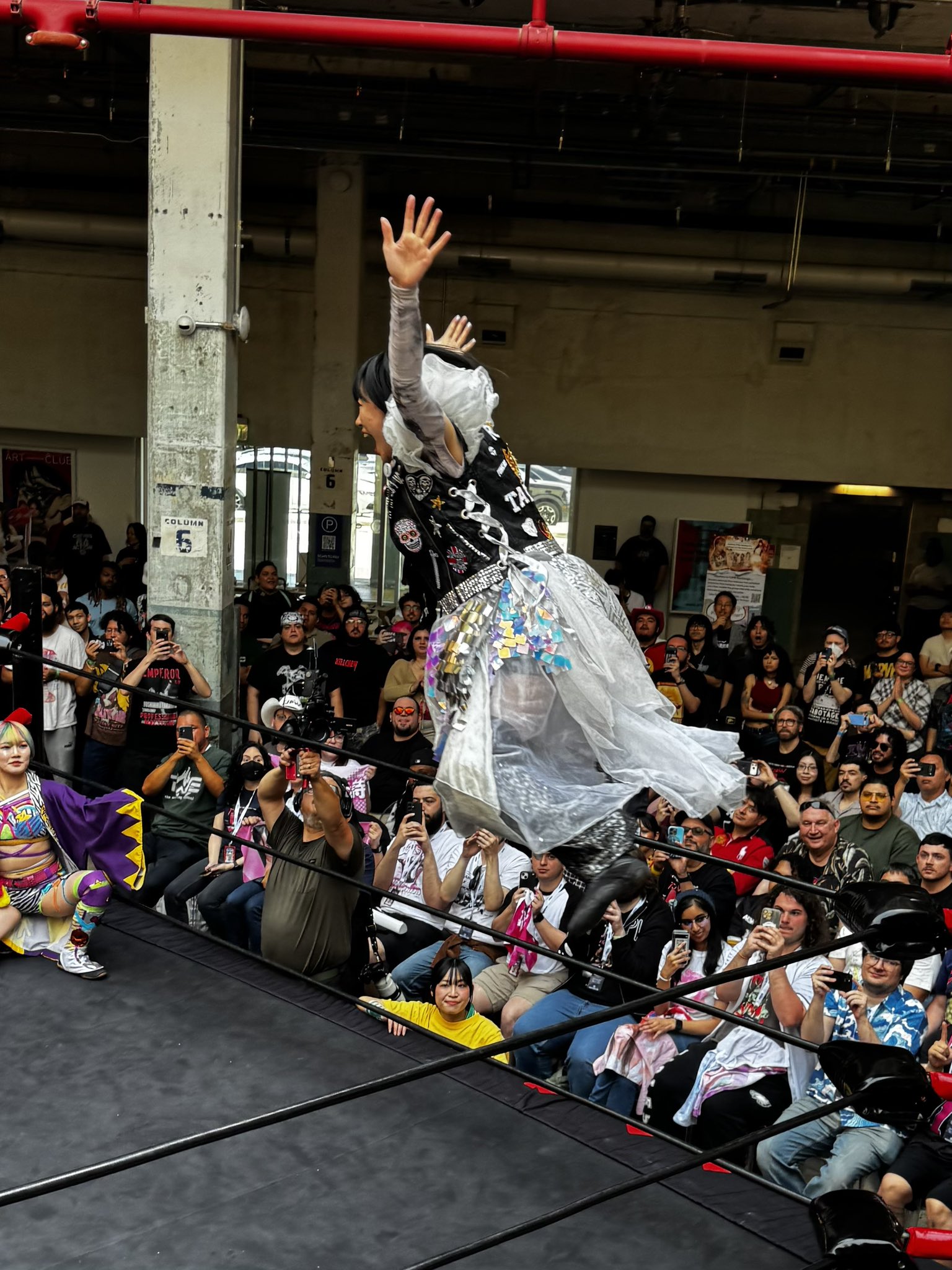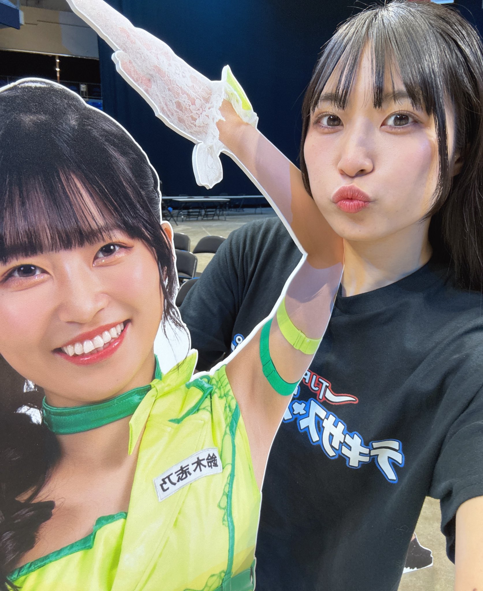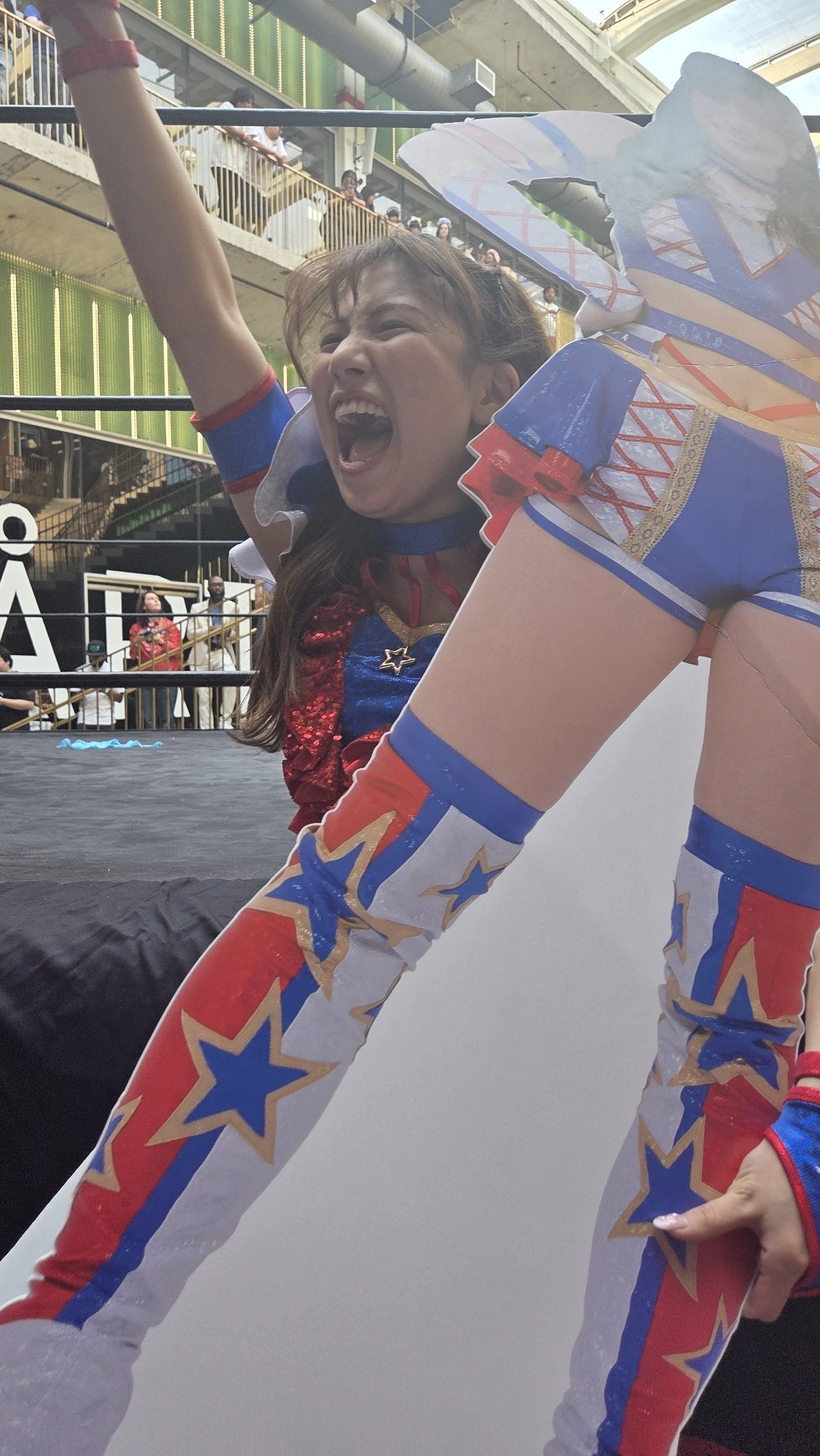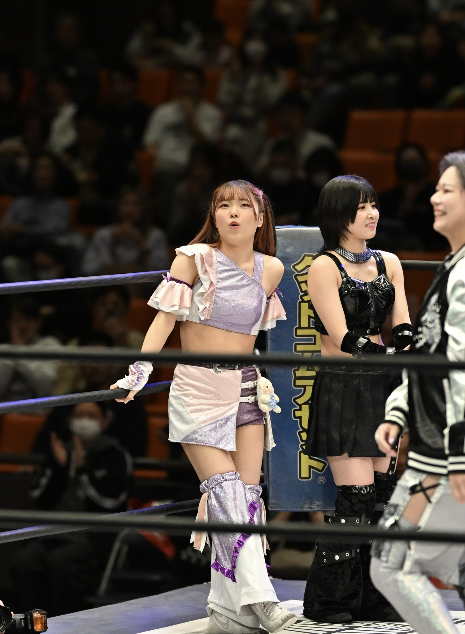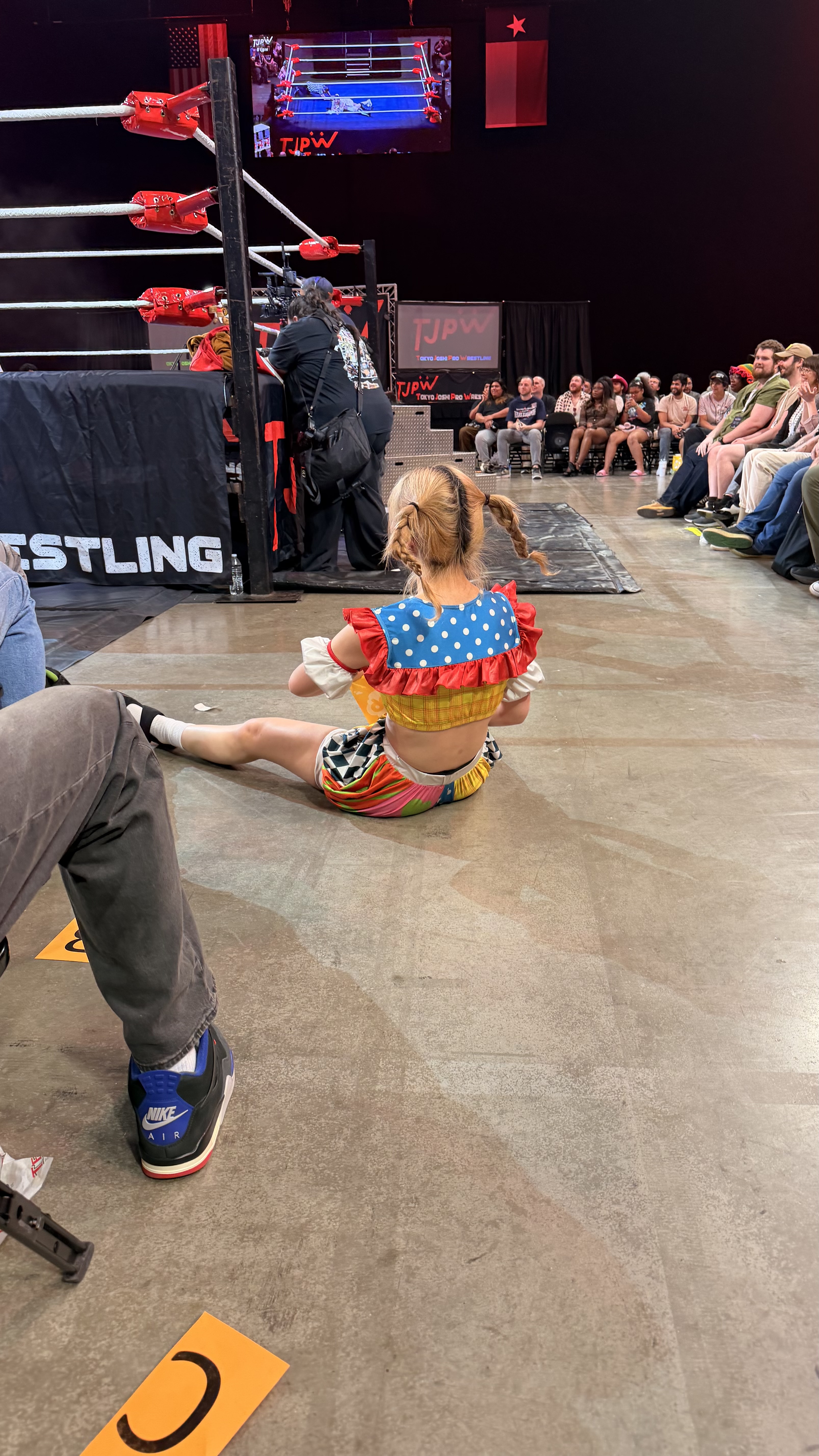 Another good show. Probably the weakest of the four, but still good. I'd say the live crowd was the strongest of the four shows, but it's kind of hard to compare because of the venue sizes. It was definitely the smartest crowd of the lot. The venue is amazing, obviously, but the drawback is that it's basically impossible to do anything cool outside the ring. I don't know how it came across on stream, but from the front row you could reach out and touch the apron with your butt still seated if you stretched a bit. Not a whole lot of notes. The Arai house key bit was amazing. I think it was her shoot house key because it flew out of her hand and landed close to me and it was attached to a whethered keychain that looked like a photo of her with a couple members of SKE48. Being so close I had a lot of players basically in my lap. Shino leaned up against me for a while, and Miyu rolled out of the ring and was lying directly on my shoes for a minute or two which was cool. Rika also more or less grabbed me by the shirt and threw me out of the way for the Shoko dive spot. Pom's shoe landed right in front of me. Miyu and Kamiyu had a LONG conversation while they were laid out on the outside. Had to deal with the cameraman in front of me all afternoon, but it is what it is. Didn't stick around for the meeto but the portrait lines looked long before the show so hopefully they do well.