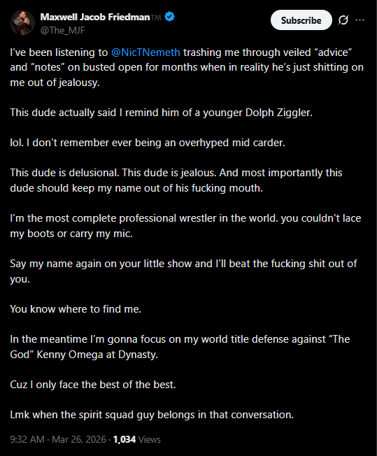 brother Nic would absolutely dogwalk MJF in a shoot. MJF is a five foot 3 singing whiney jew faggot, Nic has a legitimate shoot wrestling background. I know this is a work but that line is hilarious.