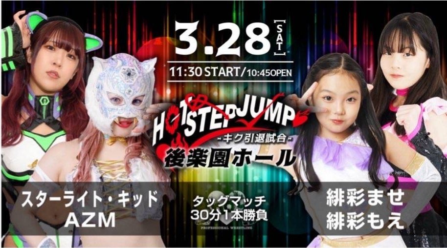 March 27th, [Sendai Girls] "Sendai PIT Tournament", Sendai PIT, Miyagi, 7:00PM JST (VOD)>Mika Iwata & Miyuki Takase (Sendai Girls/Red Energy) vs Mio Momono (Marvelous) & Hazuki (STARDOM)>Rest of card: https://sendaigirls.jp/schedule/20260327/March 28th, [Hot Shushu] "「hot!Step!JUMP!~Kiku retirement match~」", Korakuen Hall, Tokyo, 11:30AM JST>Starlight Kid & AZM (STARDOM/NEO GENESIS) vs Mase Hiiro (Hot Shushu) & Moe Hiiro (Hot Shushu)>Rest of card: https://hot-c.pro/calendar/6505357March 28th, "STARDOM in SENDAI 2026 Mar.", Yume Messe Miyagi, Miyagi, 1:00PM JST (VOD)>Saya Iida, Momo Kohgo & Yuria Hime (STARS) & Matoi Hamabe (-) vs Mei Seira (NEO GENESIS) & Maika, HANAKO & Ema Maishima (-)>Saki Kashima & Lady C (God's Eye) vs Tomoka Inaba & Ranna Yagami (God's Eye)>Suzu Suzuki, Itsuki Aoki & Akira Kurogane (Mi Vida Loca) vs Miyu Amasaki (NEO GENESIS) & Xena & Waka Tsukiyama (-)>Yuna Mizumori (COSMIC ANGELS) & Anne Kanaya (-) vs Rian (-) & Tabata (CMLL)>Syuri, Ami Sohrei & Hina (God's Eye) vs Hazuki (-) & Maki Itoh & Kikyo Furusawa (Itoh Respect Gundan)>Hanan & Bea Priestley (STARS) & Natsupoi, Saori Anou, Aya Sakura & Sayaka Kurara (COSMIC ANGELS) vs Saya Kamitani, Konami, Natsuko Tora, Ruaka, Rina & Fukigen Death (H.A.T.E.)March 29th, [Ranmaru Festa] "The Most Entertaining Pro Wrestling Show in the World, Vol. 44", 176BOX, Osaka, 12:00PM JST>Card tba: https://ranmarufesta.com/news-vol-44/Previous >>20133418