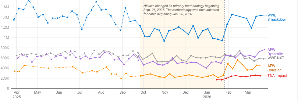>>20144928AEW's ratings have gone up lately, even factoring in the nielsen shit, but not by very much
