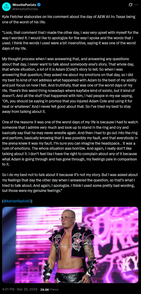 >>20148284You're late to this one anon. This is Fletcher's follow up non-apology to him saying that All In was the worst day of his life last week because he didn't get to win a midcard title when he was planned to
