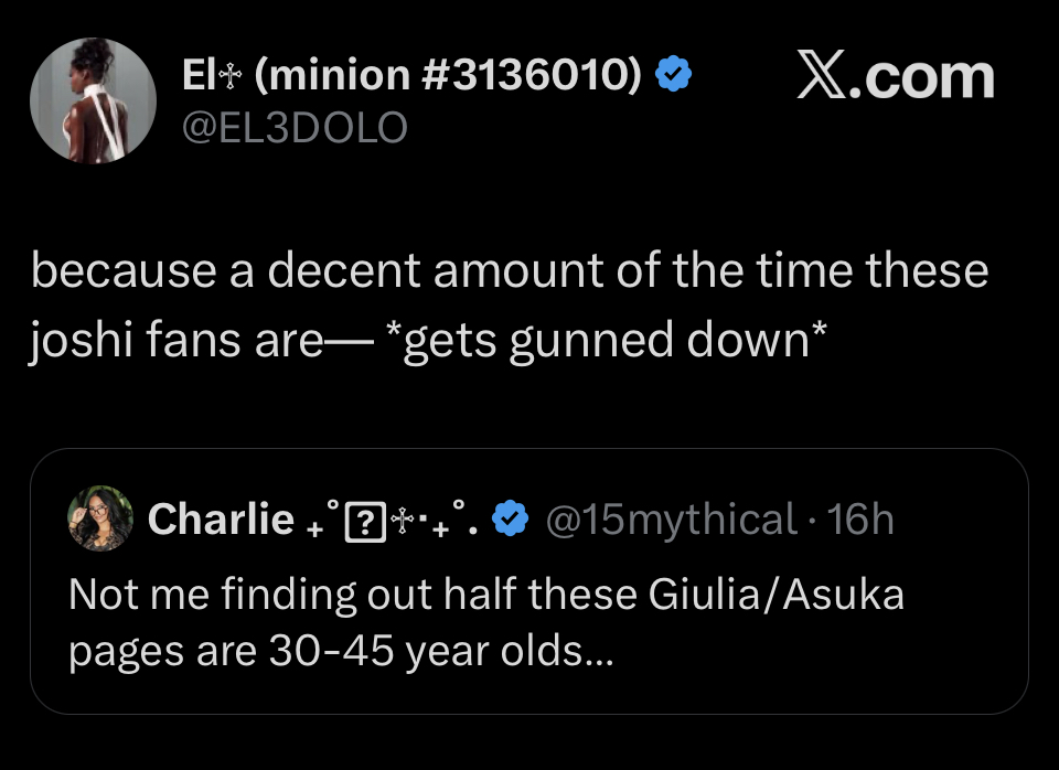 >>20151416What age should they be? Do they think some young 20 year old is going to be into older hags like Giulia and Asuka?