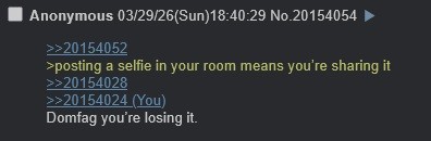 >>20154052>posting a selfie in your room means you’re sharing it >>20154028>>20154024Domfag you’re losing it.