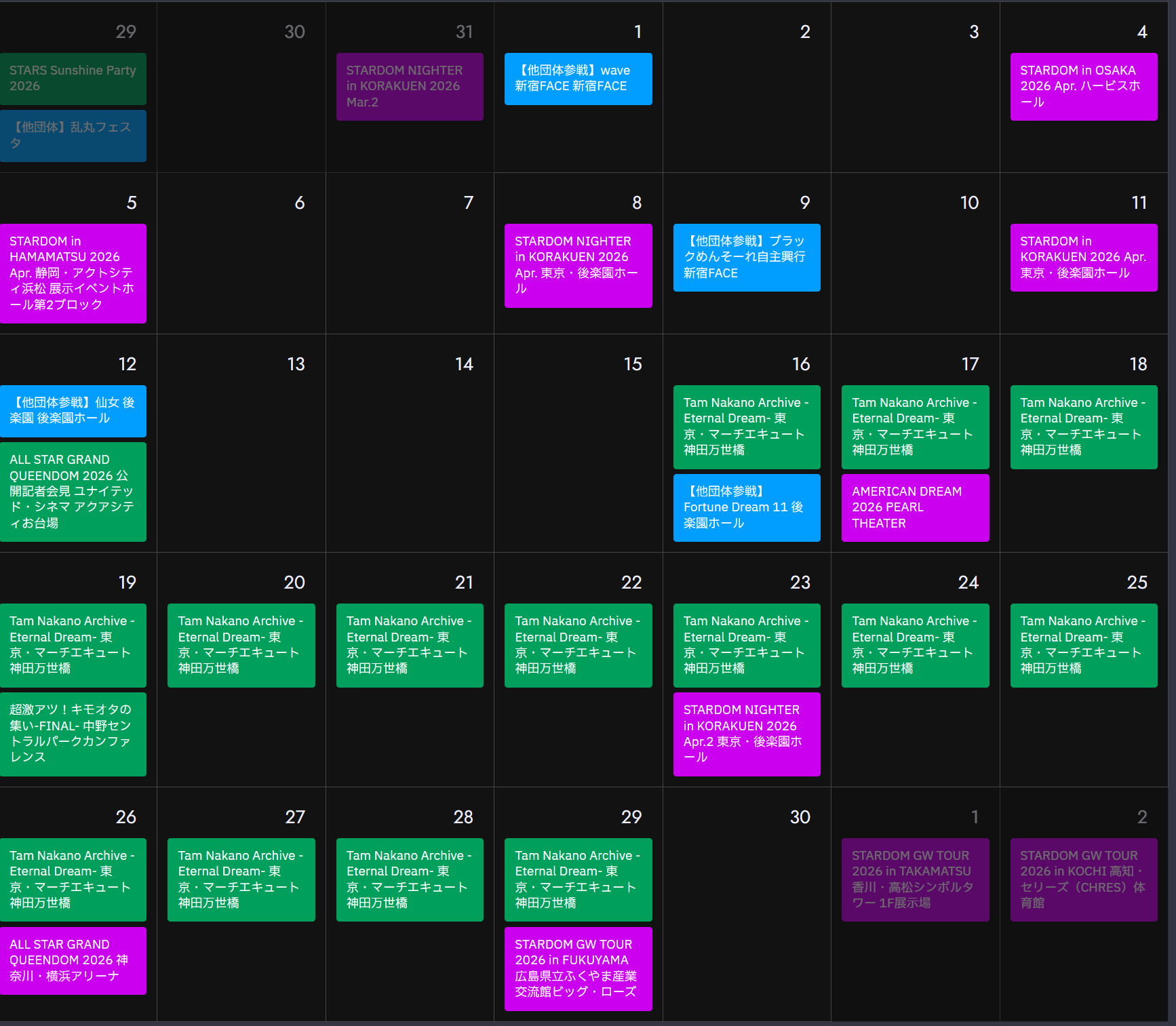 April 1st, [WAVE] "[PHASE3 Reboot 7th/NAMI*1~Apr.~'26]", Shinjuku FACE, Tokyo, 7:00PM JST>Cohaku (WAVE) & Mei Seira (STARDOM/NEO GENESIS) vs Rin (Freelance) & X>Rest of card: https://www.pro-w-wave.com/schedule.htmlApril 4th, "STARDOM in OSAKA 2026 Apr.", Herbis Hall, Osaka, 1:00PM JST (LIVE)>Rookie of Stardom 2026 1st Round Match: Yuria Hime (STARS) vs Anne Kanaya (-)>Saki Kashima (God's Eye vs Fukigen Death (H.A.T.E.)>Rest of card tba: https://wwr-stardom.com/event/2026-04-04_herbishall/April 5th, "STARDOM in HAMAMATSU 2026 Apr.", Act City Hamamatsu, Shizuoka, 1:00PM JST (VOD)>Rookie of Stardom 2026 1st Round Match: Matoi Hamabe (-) vs Akira Kurogane (Mi Vida Loca)>Card tba: https://wwr-stardom.com/event/20260405_hamamatsu/Previous >>20157639