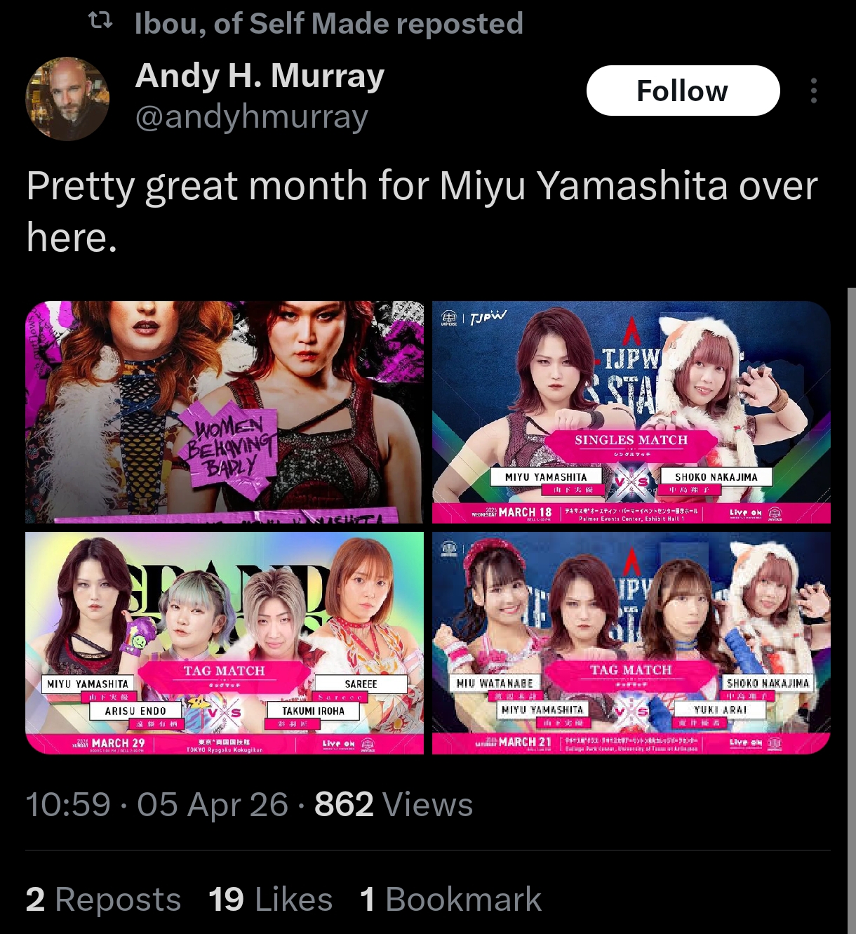 Vegas sales are so grim that Tokyo Story is sending out promotional emails with clickbait titles trying to move tickets even though they have nothing to do with the show. I guess someone called in a favor. It's not just a TJPW problem, the seat maps for all the Palms shows are looking terrible. I don't think the Collective shows are doing great numbers either. WWE is such an embarrassment.