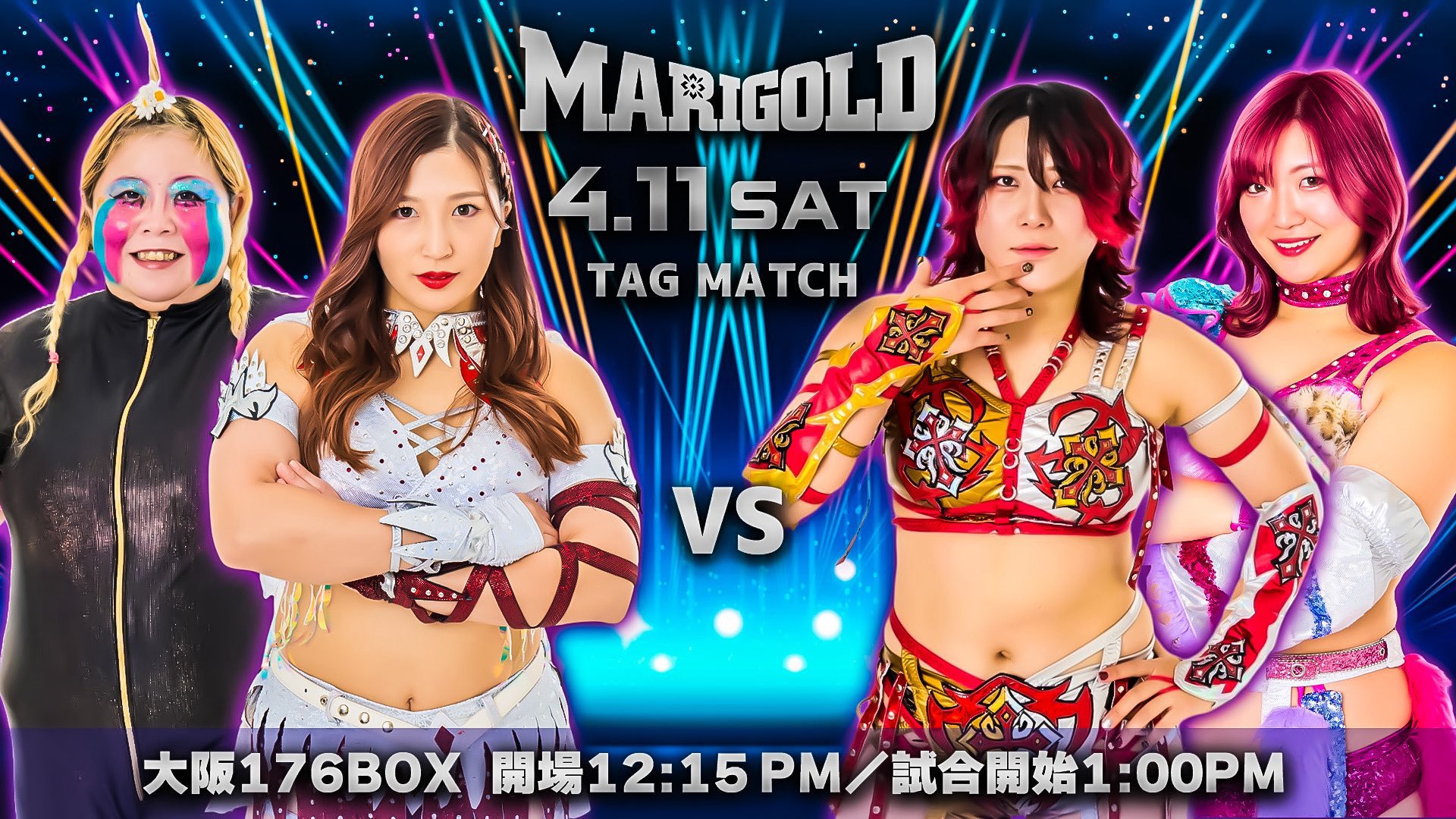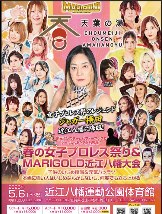 >MARIGOLD Spring Victory Series 20264/4 Niigata City Higashi Ward Plaza ((VOD 4/7 @ 8:00pm)4/5 Wohlfahrt Toyama (VOD 4/8 @ 7:00pm)4/11 Osaka 176BOX (1:00pm) (VOD 4/13 @ 6:00pm)>7 Match Trial Series #7: SYOKO vs Kouki Amarei >Miku Aono & Megaton vs Utami Hayashishita & Chika Goto >Natsumi Showzuki & Erina Yamanaka vs Mayu Iwatani & Yuuka Yamazaki >Nao Ishikawa, Hummingbird, Angel Hayze, & Maddy Morgan vs CHIAKI, Misa Matsui, Rea Seto, & Nagisa Nozaki >Victoria Yuzuki & Komomo Minami vs Seri Yamaoka & Shinno >Mai Sakurai vs AI4/12 Matsusaka City Heartful Mikumo (1:00pm)>Miku Aono, Kouki Amarei, & Seri Yamaoka vs Utami Hayashishita, Chika Goto, & Yuuka Yamazaki >Mayu Iwatani, Victoria Yuzuki, & Komomo Minami vs Mai Sakurai, Natsumi Showzuki, & Hummingbird >Maddy Morgan & Angel Hayze vs Nagisa Nozaki & Rea Seto >Shinno & AI vs Misa Matsui & CHIAKI >Nao Ishikawa vs Megaton4/14 Shinjuku FACE (Live @ 6:30pm)4/19 APA Hotel & Resort Sapporo (11:45am)>Twin Star Championship: Misa Matsui & CHIAKI (c) vs Angel Hayze & Maddie Morgan4/19 APA Hotel & Resort Sapporo (4:30pm)4/20 Aoki Clutch 01 @ Shinjuku FACE>Seri Yamaoka & Yuuka Yamazaki vs Chihiro Hashimoto & Manami4/25 Korakuen (Live @ 11:30am)>Marigold World Championship: Miku Aono (c) vs Utami Hayashishita4/29 GanPro @ Korakuen (11:30am) >Utami Hayashishita vs YuuRI>Socialshttps://dsf-marigold.comhttps://x.com/DSF_Marigoldhttps://x.com/Marigold_Joshihttps://x.com/hashtag/pw_mghttps://www.instagram.com/dsf_marigold/https://www.youtube.com/@MARIGOLD-ho5nzWatch on Wrestle Universe (¥1,298 per month)https://www.wrestle-universe.com/en/marigold>Entrance musichttps://youtube.com/playlist?list=OLAK5uy_mz1s3xkNlFsMmySZlRdsEkxjj2isTVUEsPrevious >>20184159