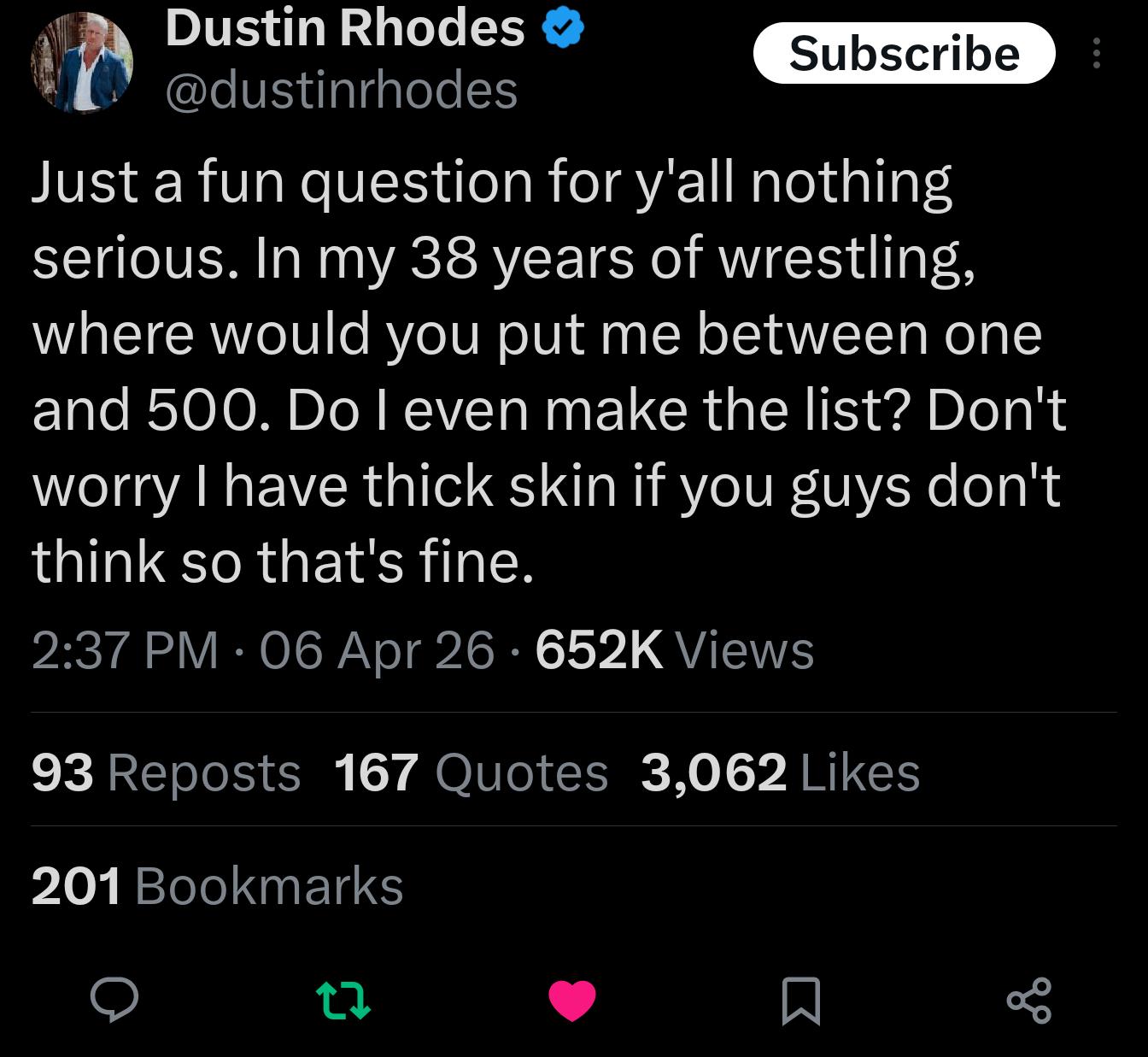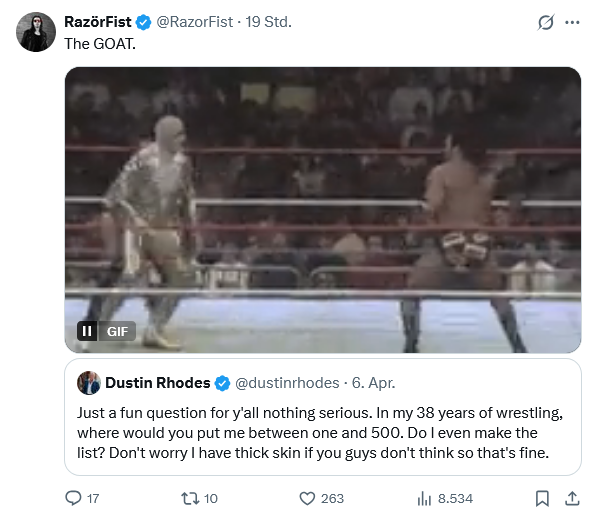 >>20203860Gimmick & entertainment value wise? Goldust is easy top 100Dustin Rhodes? probably top 1000 if generous.