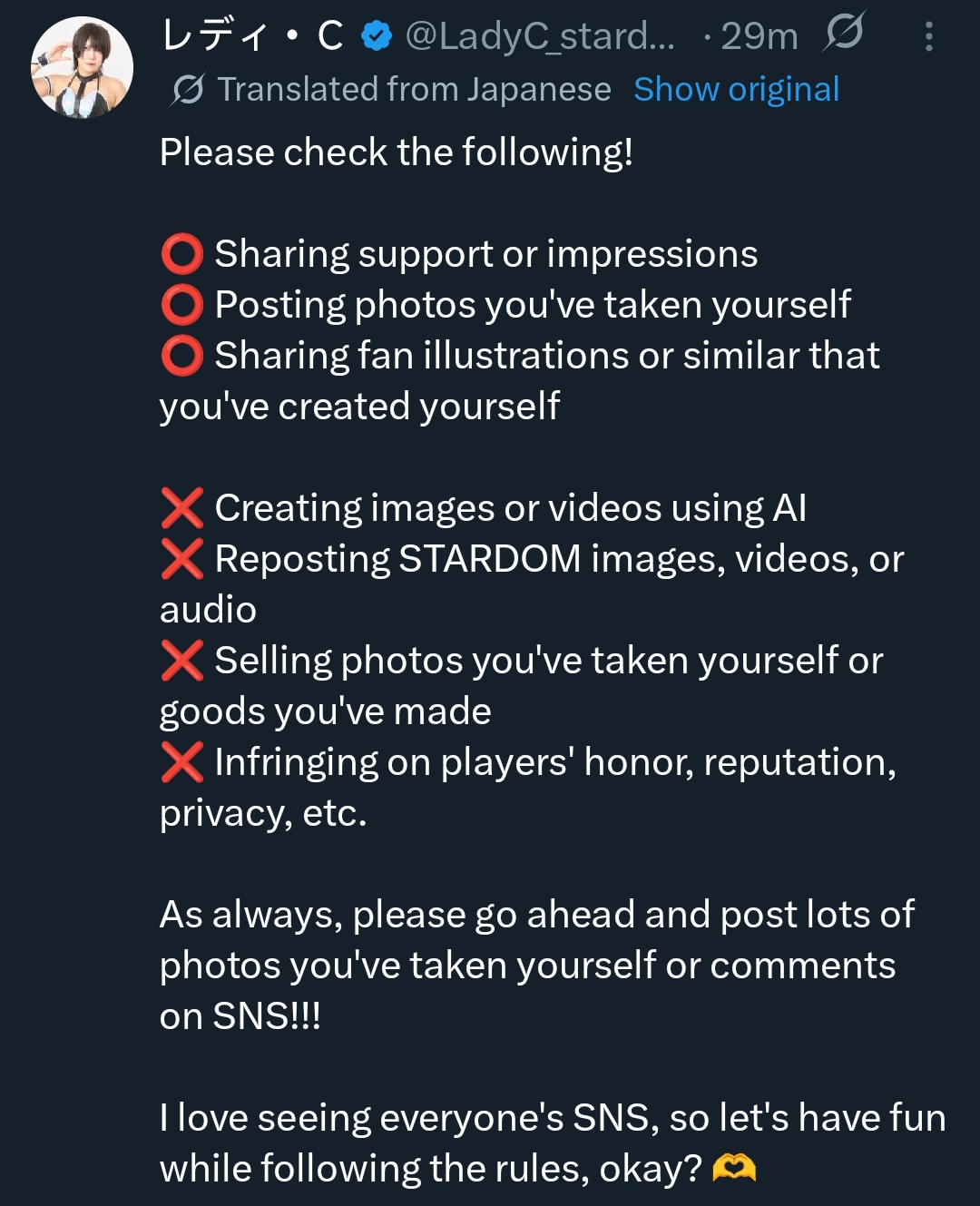 >Thank you very much for your continued support of Stardom.>Recently, we have observed numerous instances of individuals using the likenesses, voices, etc., of athletes owned and managed by our company to create and publish new images and videos using AI generation tools. These actions may not only infringe upon our copyrights and publicity rights, but in some cases, they may also infringe upon the personal rights and privacy rights of our affiliated athletes.>From the perspective of appropriately protecting the rights of our players and our intellectual property, we do not, in principle, permit the following actions.>- Reproduction of images, videos, audio, etc. owned by our company>; - Publicity of our affiliated athletes or commercial use of our intellectual property, etc. (including those you photograph or produce yourself)>; - Any other act that infringes on the honor, reputation, privacy, or other rights of our company or our affiliated athletes.>However, we continue to welcome fans to share their support and impressions, take their own photos (in accordance with the rules of attendance and other regulations of each venue/event), and post their own fan art, provided that it is for non-profit purposes and within an appropriate scope.>Regarding prohibited actions, we will consider taking strict measures, including civil and criminal action, in consultation with our legal counsel, for those deemed particularly malicious, such as those that harm the dignity of the players. If you come across such content on social media, etc., we ask that you refrain from spreading it and cooperate in taking appropriate action by using the reporting functions of each platform.>We believe that protecting the rights of each individual athlete is essential to delivering better content to everyone.>We would greatly appreciate your continued understanding and cooperation.https://wwr-stardom.com/news/260410_announcement/