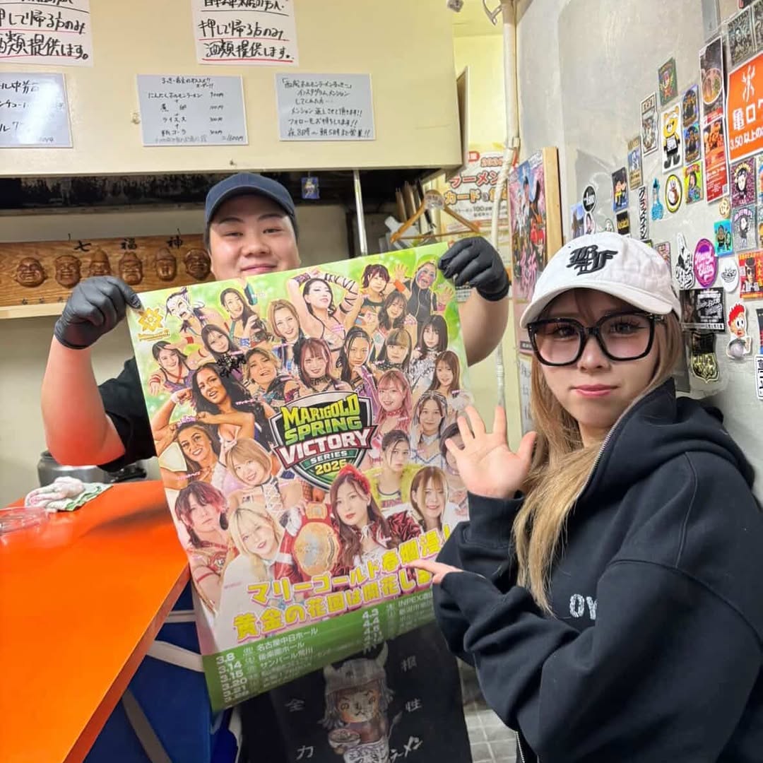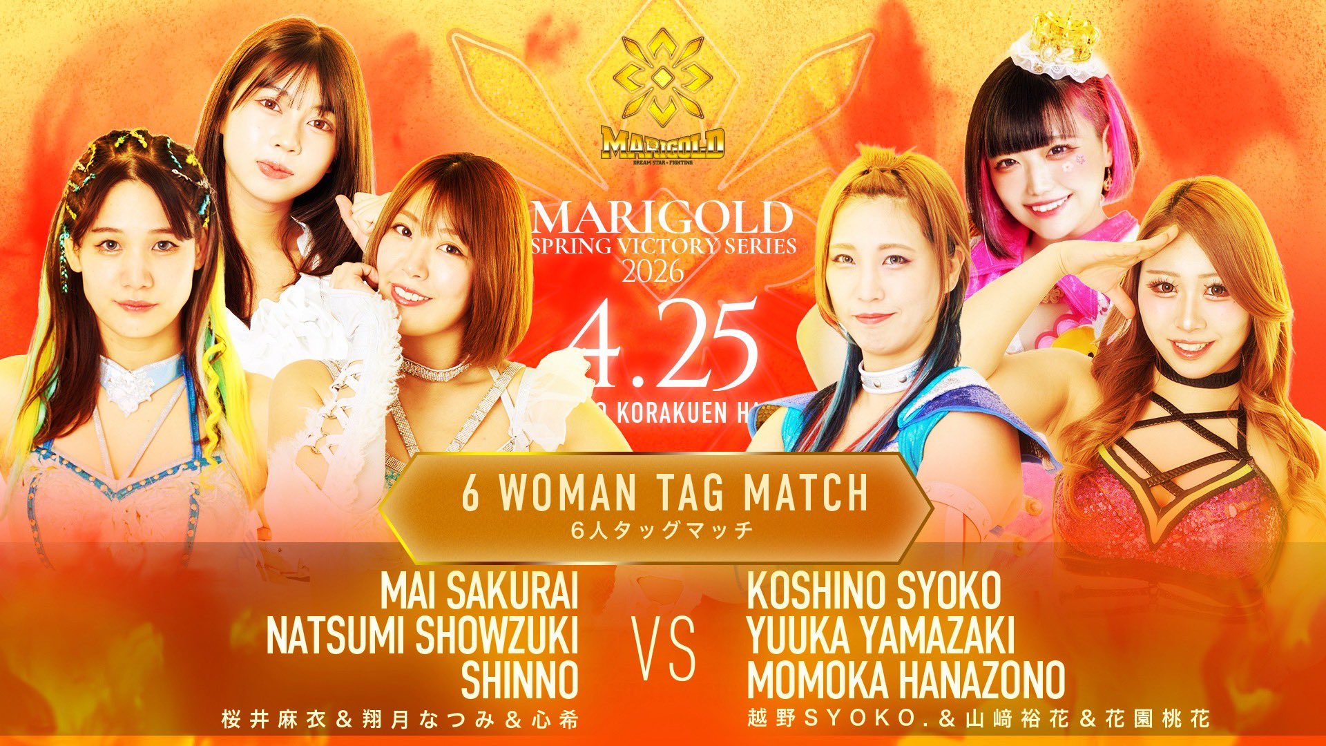 >MARIGOLD Spring Victory Series 20264/19 APA Hotel & Resort Sapporo (11:45am)>Twin Star Championship: Misa Matsui & CHIAKI (c) vs Angel Hayze & Maddie Morgan4/19 APA Hotel & Resort Sapporo (4:30pm)4/20 Aoki Clutch 01 @ Shinjuku FACE (Live @ 6:30pm)>Seri Yamaoka & Yuuka Yamazaki vs Chihiro Hashimoto & Manami4/25 Korakuen (Live @ 11:30am)>Marigold World Championship: Miku Aono (c) vs Utami Hayashishita>British Empire Women's World Championship: Angel Hayze (c) vs Seri Yamaoka4/29 GanPro @ Korakuen (11:30am) >Utami Hayashishita vs YuuRI>SHINING ATTACK 20265/3 Kinshicho Marui Building 8F Event Hall (1:00pm) 5/4 Tsukuba Capio (1:00pm)5/5 Marvelous @ Yokohama Buntai (Live @ 4:00pm)>Rin Retirement Match: Rin & Mayu Iwatani vs Mio Momono & Itsuki Aoki 5/6 Omihachiman Sports Park Gymnasium (1:00pm) 5/8 Kumamoto Shintoshin Hall (6:30pm) 5/9 ACROS Fukuoka (1:00pm) 5/10 Ishin Hall (1:00pm) 5/16 Korakuen (11:30am)5/19 Sukeban New York @ Hammerstein Ballroom (7:30pm EST)>Dangerous Liasons (Lady Antoinette & Countess Rea Seto) vs Harajuku Stars (Saki Bimi & Yukina Uehara)>Commander Nakajima & Victoria Yuzuki vs Rina Yamashita & Supersonic vs BINGO & Midnight Player vs Delirious Dolly & Seri Yamaoka>Mayu Iwatani & Nagisa Tachibana vs Smack in the Box Misa Matsui & Kouki Amarei5/23 Marigold Shine Forever 2026 @ Ota Ward Gymnasium (PPV @ 2:30pm)>Socialshttps://dsf-marigold.comhttps://x.com/DSF_Marigoldhttps://x.com/Marigold_Joshihttps://x.com/hashtag/pw_mghttps://www.instagram.com/dsf_marigold/https://www.youtube.com/@MARIGOLD-ho5nzWatch on Wrestle Universe (¥1,298 per month)https://www.wrestle-universe.com/en/marigold>Entrance musichttps://youtube.com/playlist?list=OLAK5uy_mz1s3xkNlFsMmySZlRdsEkxjj2isTVUEsPrevious >>20233102