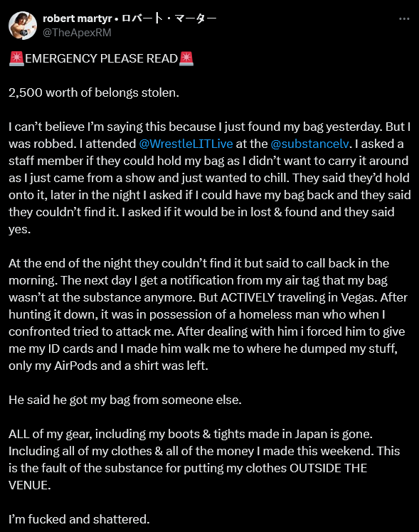 I feel bad for him, but you have to be crazy to leave money sitting around at an indy show. I don't know who I'd trust less - random strangers or the wrestlers.