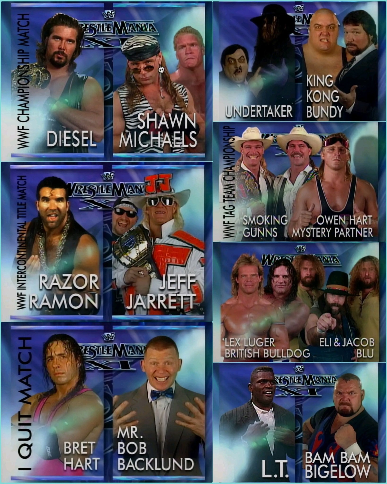 >>20268664Diesel/Bret, Razor/Shawn, Lawrence Taylor teams with Lex Luger to take on Bam Bam and, idk, Tatanka or someone, Taker vs Lawler.