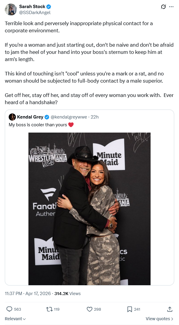 I don't even like Shawn but why is this mentally ill cunt presuming to understand the relationship between HBK and Kendal Grey? the Kendal girl clearly has no problem with what is happening and is posting the picture gladly. Like I doubt he'd hug her like that if they weren't very friendly already.