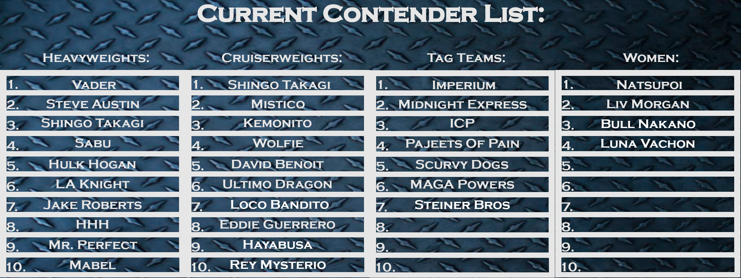 I gotta be honest, I am not that familiar with AJPW stuff, so if I'm going to start adding those guys I will have to do some research. I honestly have no ideas for any of the 4 pillars at present but that will probably change if I educate myself a little more.