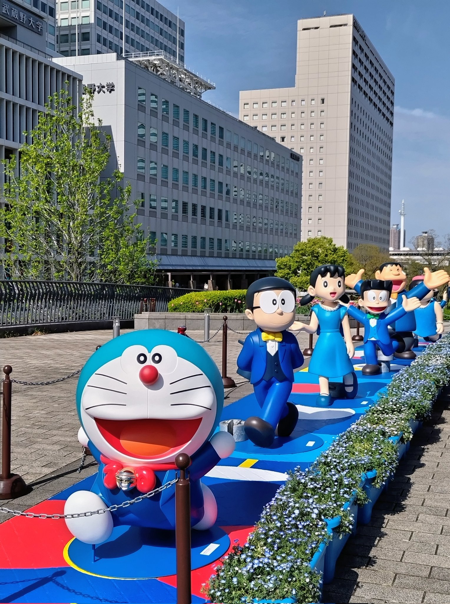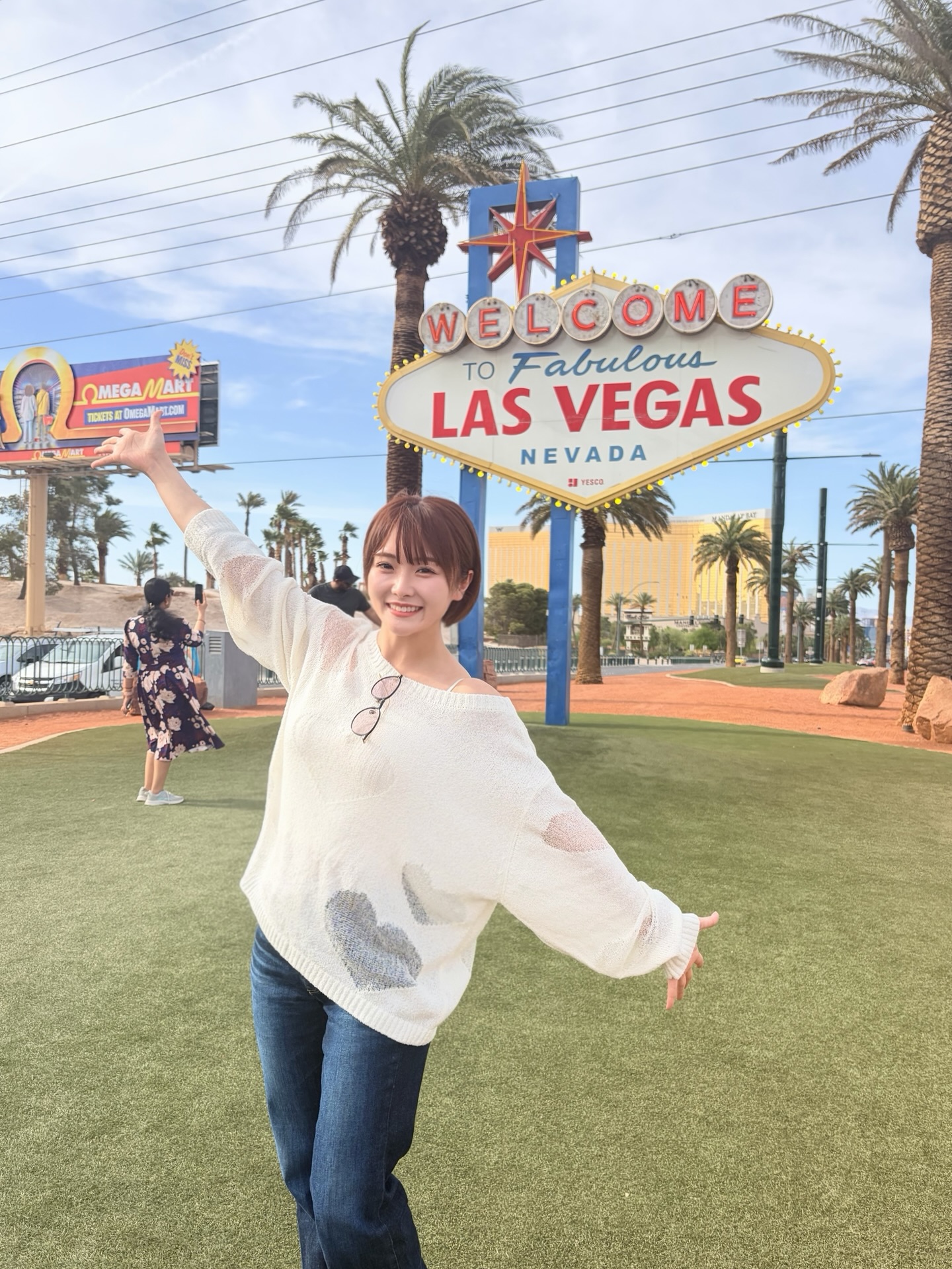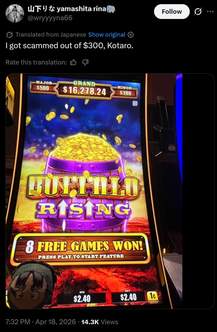 Taro, other suits, Sumie Sakai and the roster just showed up in front of the Hyper X Arena, but the gate is still down. They were lined up waiting for someone to bring them through the back entrance. I didn't want to cut through their line so I went between the slot machines and waved and said Hi. The only one's looking my way were Fuwa, Sumie and Mei, who was sitting on one of the slot machines stools. She looked up and smiled at me and can confirm that Mei is really cute.