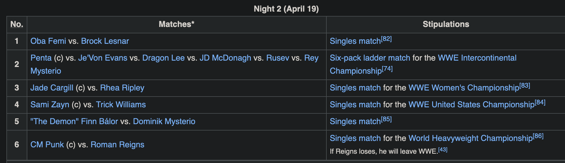 >>20286238>Brock vs Oba7m>Ladder15m>Jade vs Rhea9m>Sami vs Trick12m>Balor vs Dom11m>Punk vs Roman30m + 15m of introThat will be just shy of 90m of actual wrestling which is in line with night one.