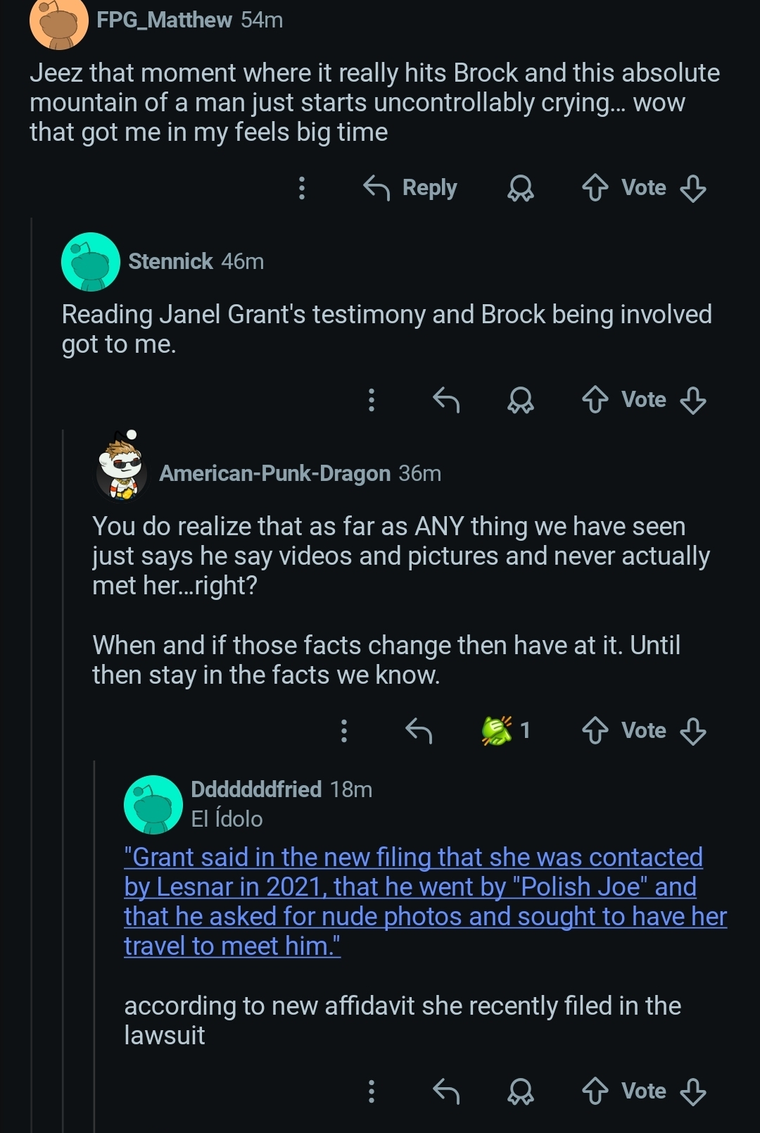 >>20290322Liberal here, nothing wrong as far as Janel Grant goes.>Vince started fucking a women in his building >She's a freak in bed and blows his mind>Starts dating her privately >Gives her job (wrong)>Asks her to fuck other people>Fucks her too rough with dildos (wrong)>Ends things>Stops paying her (wrong)Brock>Agreed to fuck her>Asks for pics & videos>Doesn't fuck her because of snowYou can infer that Vince and him might have done that before. Janel says she was uncomfortable with the entire thing, but that's odd because she went along with so much for so long and only spoke out when the money stopped. There are valid reasons to hate Brock.>He's a conservative >He's been homophobic >He phones it in a lotBut idk, it's never really bothered me. Dude is hella autistic and doesn't publicly say much, push an agenda or try to get political. His homophobia is like a decade old and he didn't even seem that passionate about it. Just mentioned offhand that he doesn't like gays. I doubt he even cares that much but who knows. I'm genuinely shocked and sad he retired.