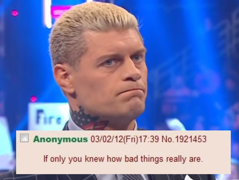 >>20294285>>20294306>>20294319To be clear, I was just picking a reaction image at random. Cody's matches are mostly dogshit, but for different reasons. Roman just doesn't fucking do anything. It's just his two signatures and a lot of really bad brawling.
