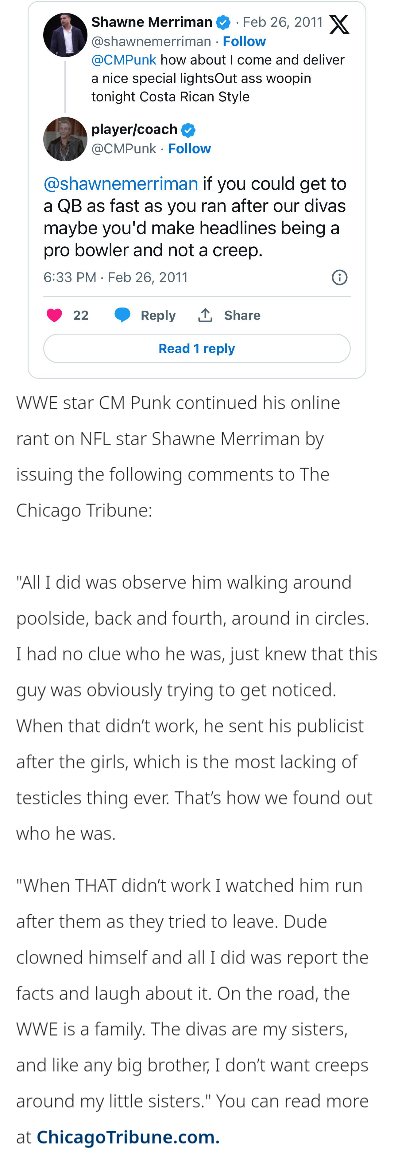>>20298607>By the way, we're told fans harassing wrestlers at their hotels has become an increasing problem in the WWE Universe -- and now we're seeing firsthand evidence of it.>Punk then coldly stares at the man, who is so terrified that he runs off while apologizing profusely.Doesn't sound like he did anything other than film someone in a public space without causing any kind of a problem. You're in the wrong, Punk