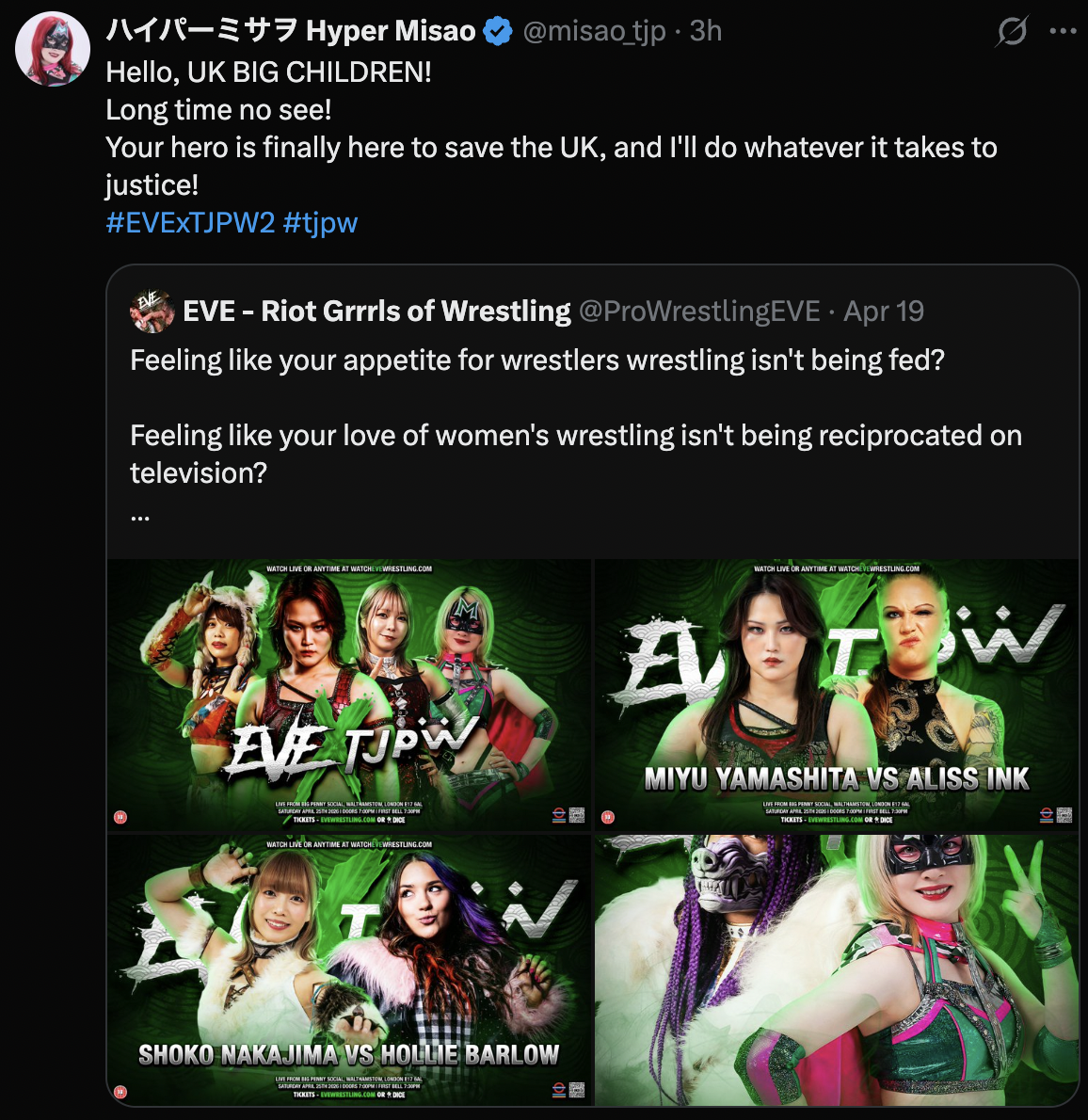Watch on Wrestle Universe - 1,298 yen per month.https://www.wrestle-universe.com/enSchedule4.24 TJPW SPRING TOUR 2026~NEXT DOOR~in SHINJUKU @ Shinjuku FACE, Tokyo (LIVE)[19:00 JST]4.25 EVE x TJPW 2 @ Big Penny Social, London (LIVE on Youtube)[19:30 BST]4.26 SAJ X TJPW @ Sporting Cesate Via Dante 72, Milan [15:00 CEST]4.29 WRESTLE UNIVERSE Members Only Event "Pre-Tokyo Joshi Pro-Wrestling.10" @ Itabashi Green Hall, Tokyo (VOD)[15:00 JST]Previous>>20295943
