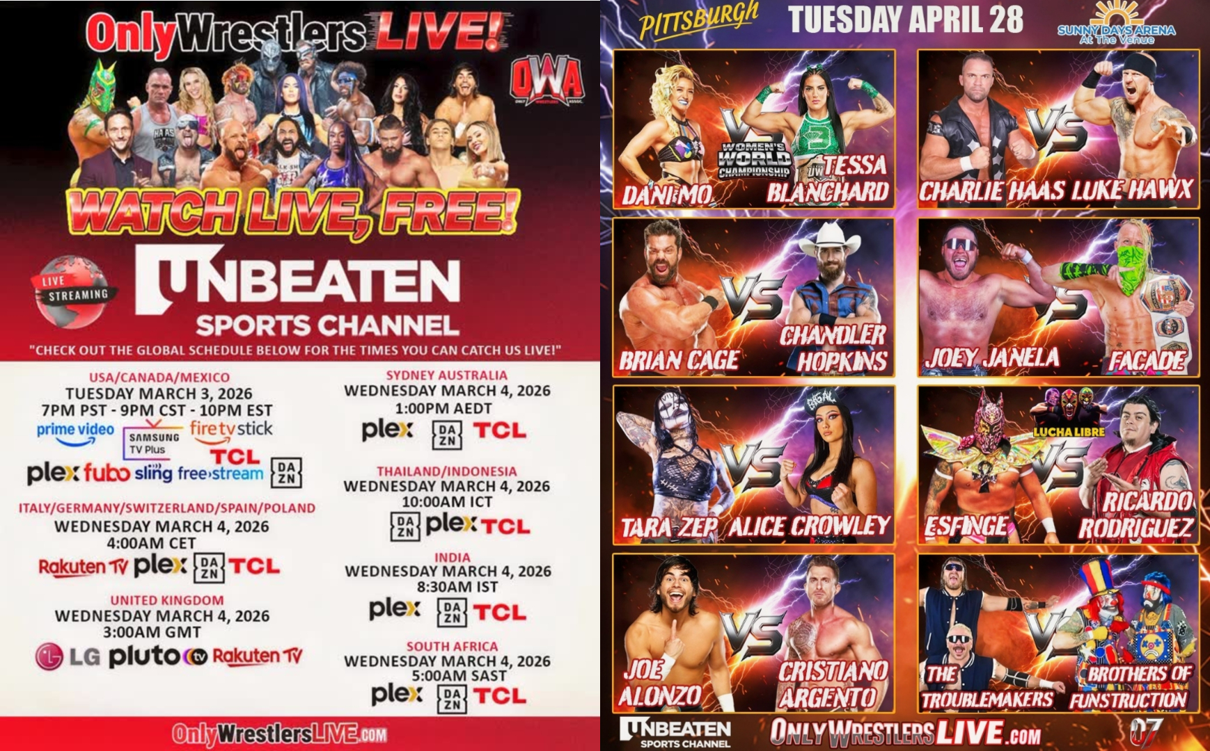 OnlyWrestlers is back but this time it will make its Pennsyvlania debut at the Sunny Days Arena in North Versailles, Pennsylvania on Unbeaten Sports Network (free to watch) and OnlyWrestlers.com at 7 PM EST (check the photo for other timezones listed and the services listed for the channel). Card is below.
