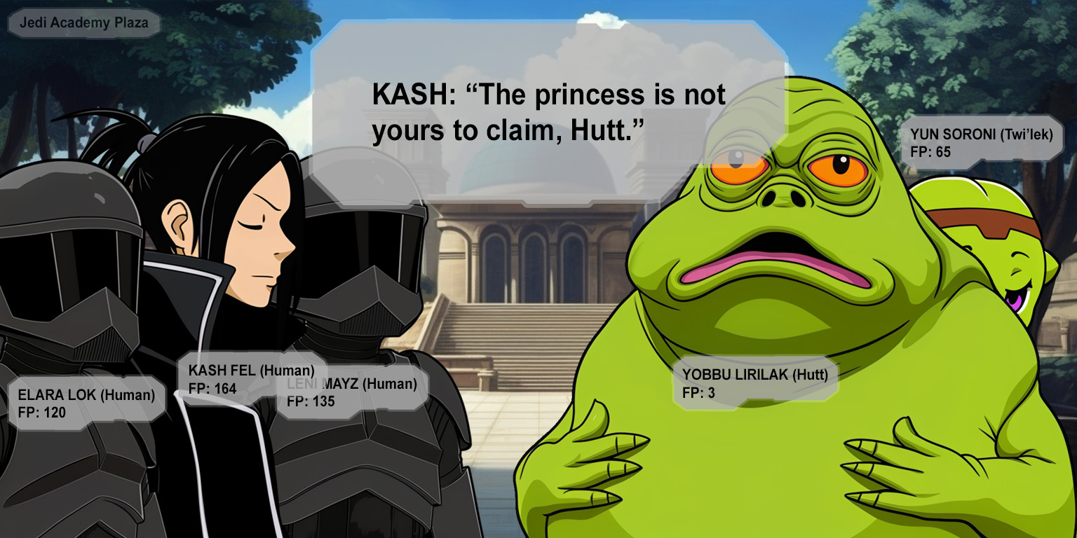 Tamis grins back and then looks past Cady as she smiles. "Oh! Lord Fel!"Cady turns and sees Kash standing across from Yobbu in the academy plaza. As Cady and Tamis walk closer, Elara and Leni glance at them and then they all look at Cady.I have a bad feeling about this...Yobbu slides toward Kash and waves his arms. "No luggin blondee, Kash Fel." Yobbu looks down at Cady and licks his lips. "Zugga blondee!""Um..." Yun bows at Kash from behind Yobbu. "Mighty Yobbu declares Princess Omega is to be wed to himself, and no other."Now Yobbu's involved? Was it really his idea to confront Kash, or did Yun set this up somehow?Comment too long. Click here to view the full text.