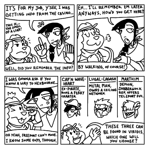 Jail Quest: a text adventure occasionally illustrated.A night of drinking and a failed attempt to cheat on cards had landed you the strangest job slash community service sentence you've ever had: ensuring Gongalla Gaol survives the reality storm called Singularity.Now you travel around with your employer and a handpicked crew to survey the four Reality Anchors. Hey, beats being tarred and feathered, right?Previous thread:https://suptg.thisisnotatrueending.com/qstarchive/2026/6322745/Gongallaverse:https://suptg.thisisnotatrueending.com/qstarchive.html?tags=Gongalla%20GaolYou are currently Craig Snorlison, goblin kid prodigy! You were traveling with your aun- err, older cousin Rosa Montagni, on her job to save Gongalla!But then you have to wait for her in this hotel in Viridis with her boss, Nemo. One of your spirits, Scholar, has bonded to you and requires you to read at least a chapter every day, but it gets boring reading the same grimoire over and over again.Comment too long. Click here to view the full text.