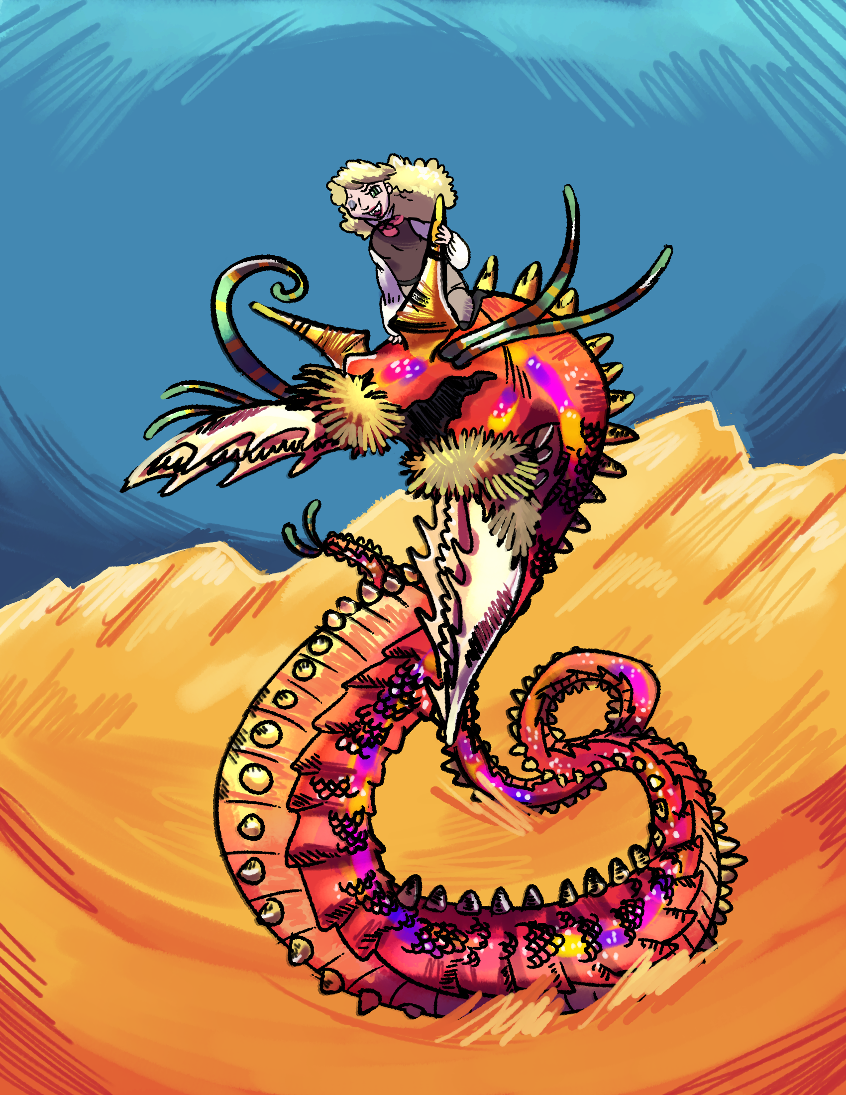 Then you explode in light and lizard. The light's for no reason but drama. It looks cool. The lizard— #301 meant a fence lizard, clearly. A little guy. But look: if he wants to make you a lizard, offered to make you a lizard, when you were planning on being a lizard anyways, could you turn down something so gracious? It hits the preexisting lizard parts first: your tail stretching like taffy, your claws curving over your fingertips, your lips peeling over your jaw, your scales bubbling over your neck and face. You wouldn't call it comforting, but it's far more familiar. And Richard, from the buzz in your head, is keeping tabs on the pain.«I was taken by surprise last time. My error.»Then it goes for the rest of you. You note a mounting of pressure and terrible twinge where— you assume— you should've collapsed in on yourself. But Richard goes «Hmm» and «A-ha» and you jackknife instead, head to knees, then rebound in the opposite direction. Mostly your neck rebounds, as if spring-loaded, pulling your head up and up. Which has happened before, too, but you've hardly ever been lucid.«I am glad of your extreme experience in turning into lizards.»No kidding. You're not quite captain of this ship, but you've got your hand on the tiller. The trouble is, now you're not sure what's happening to the rest of you. Arcing your neck way back down, you discover slender, elongated arms and legs: not what you think of when you think "Herald," but you were a little worried about holding The Sword, so you'll take it. Your tail is enormous. The spines on your back are much longer. Actually, it's not nearly as much change as you—Your nose pushes in. Your head crooks 90 degrees as your jaw grinds. Your gums bleed— you taste it— from the new teeth coming in. Sharp teeth. Then your eyes treble and your tongue narrows and your hair (this is the only thing that actually disquiets you) sheds all at once, drifting around you, catching on your neck, and you're bald. Which is normal for lizards. It's just that you like your hair.But then it's over. You feel mostly like yourself but longer. And with sharper eyesight. And a face rotated around. But mostly yourself— Charlotte Fawkins— with nothing obviously crowding in on your thinking, not even native fear. This body doesn't comfort you, but you are comfortable enough inside it. Inside the Herald. What you always were and always will be.>[+3 ID: 7/16]Though you're still confused about the arms and legs. Richard?«Er. It's a variant depiction.»«Sometimes the Herald is more bestial, but very often it is shaped... how we are shaped, only further exaggerated.»Which is why the neck is so long?«Yes. And the tail.»Right. Wow! Neat! You didn't know you'd have variants. (You were more worried about the arm situation than you thought.) It's very, very funny to think that, while none of this is real, literally exactly this will happen in just a few hours. In real life. Thanks for the dry run, #301!