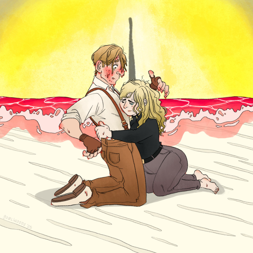 Has Jean Ramsey showed even one tiny hint of wanting to change? Monty hated her from the very start, but he offered her a berth in Base Camp for free, out of the goodness of his heart, and she repaid him by stealing the Crown for herself and running off. Her grand ambitions for the fate of the world amounted to killing as many people as possible for fun. She's done so many terrible things— but Monty did terrible things too, and Madrigal, and Earl, and Horse Face, and honestly most people you know. Even Gil. Even you. But when you found out how awful you were, you did your absolute best to get better, even though it was horrible and difficult and you still don't always get it right. Even Richard, of all people, has been doing his best. Maybe it'll never make up for what he did to you, but you can't pretend he's exactly the same as he was.Jean Ramsey is exactly the same as she was. She probably always will be. You'd have to get into her brain to change that, probably burn parts out, and at that point it'd hardly be Ramsey anymore. It'd just be cruel.The hilt and blade of The Sword are now gloriously worm-sized, and you feel nothing but triumph as you squirm around with it, slashing up Ramsey's insides, before arcing up through her back, breaking bone, piercing skin, emerging in a shower of gore. This should be enough to kill her. But what have you been promising to do?Supremely flexible, you swing around and bring the flaming Sword down on the back of Ramsey's neck. Her head does not fly off. The blade catches on her spine. But you double down and press and press until it swings clean and bright and, with a thunk, Jean Ramsey's monstrous head, Crown sutured to it, lands on the ground.And it is over. Her body is limp around you. You feel such a powerful rush of relief, clean clear bright relief, that you wobble and your head swims— and you hardly know what's happened, something about water, something about light, just that your body is dwindling rapidly, suddenly, such that you're drawn out of Ramsey's corpse and into yourself, bundling into yourself, like winding up a ball of yarn, and it's ten seconds until you're flat and groggy and glowing conspicuously blue on the ground. You're still armored. The Sword, sword-sized, is in your hand. ...Gil?But Gil isn't here. Gil is coming from the opposite direction, flitting, then running, all the way up to you. You've been picking yourself up (so many limbs all of a sudden), and he catches you by the shoulders when he reaches you, catches and squeezes and looks as if he might say something else, or do something else, but doesn't. His attention is drawn behind you. At...(2/3?)